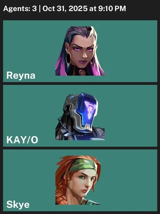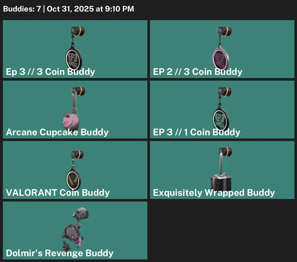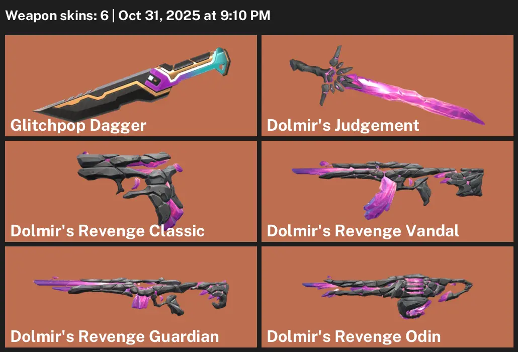 🌘 NA 😌 Unranked 💀 6 Skins 🥥 250 VP 😅 3 Agents 🚴♀️ Value: 4350 VP 🌸 Glitchpop Dagger 😇 Dolmir's Judgement 🍴 Dolmir's Revenge Classic 🥼 Dolmir's Revenge Vandal 🐈 Dolmir's Revenge Guardian ⚒ Dolmir's Revenge Odin