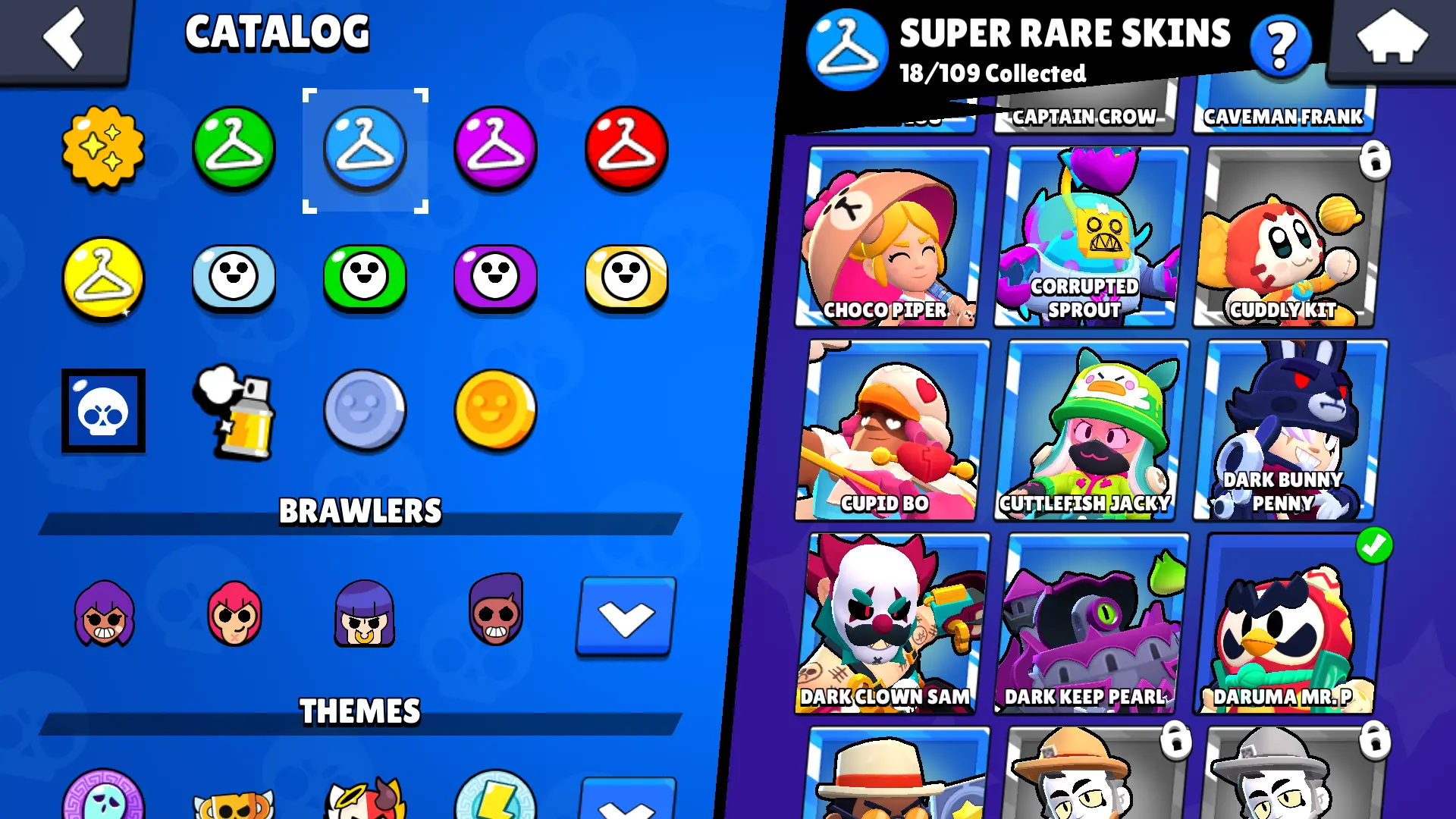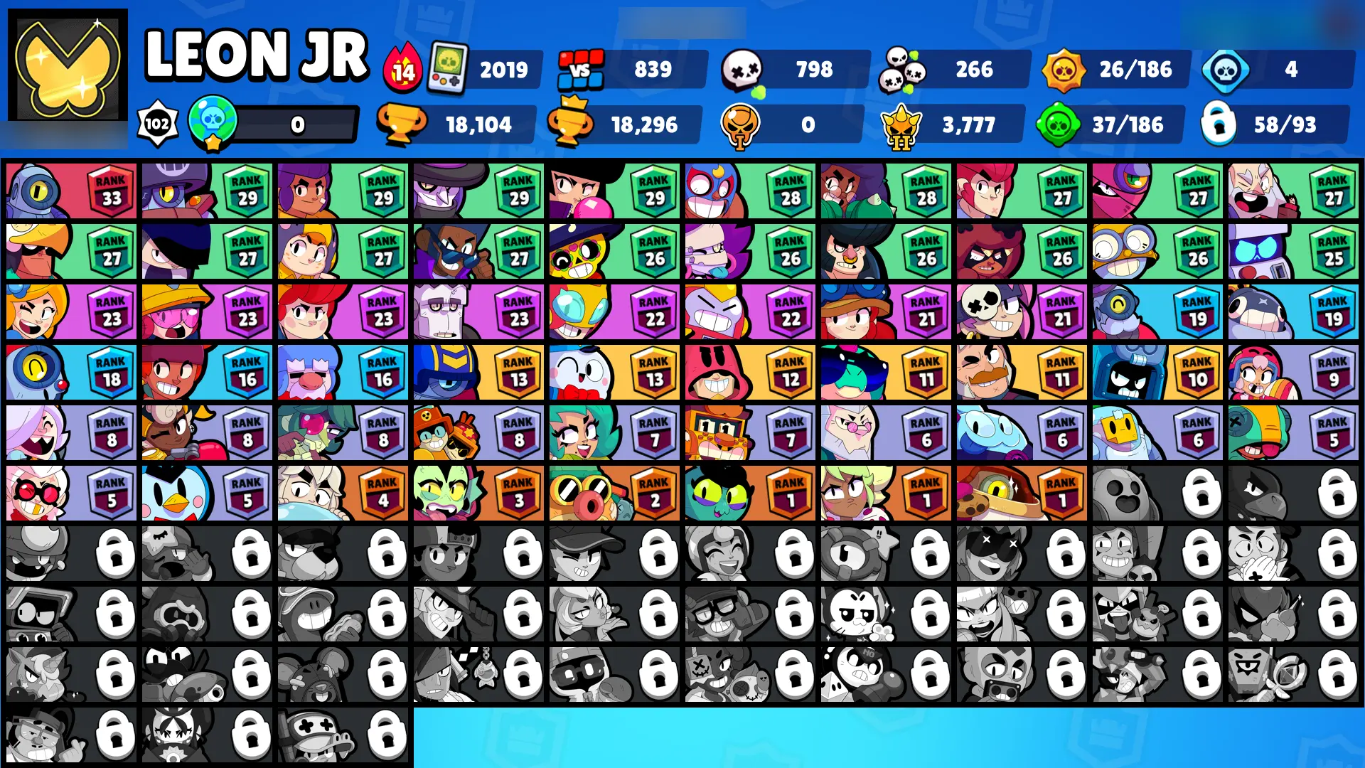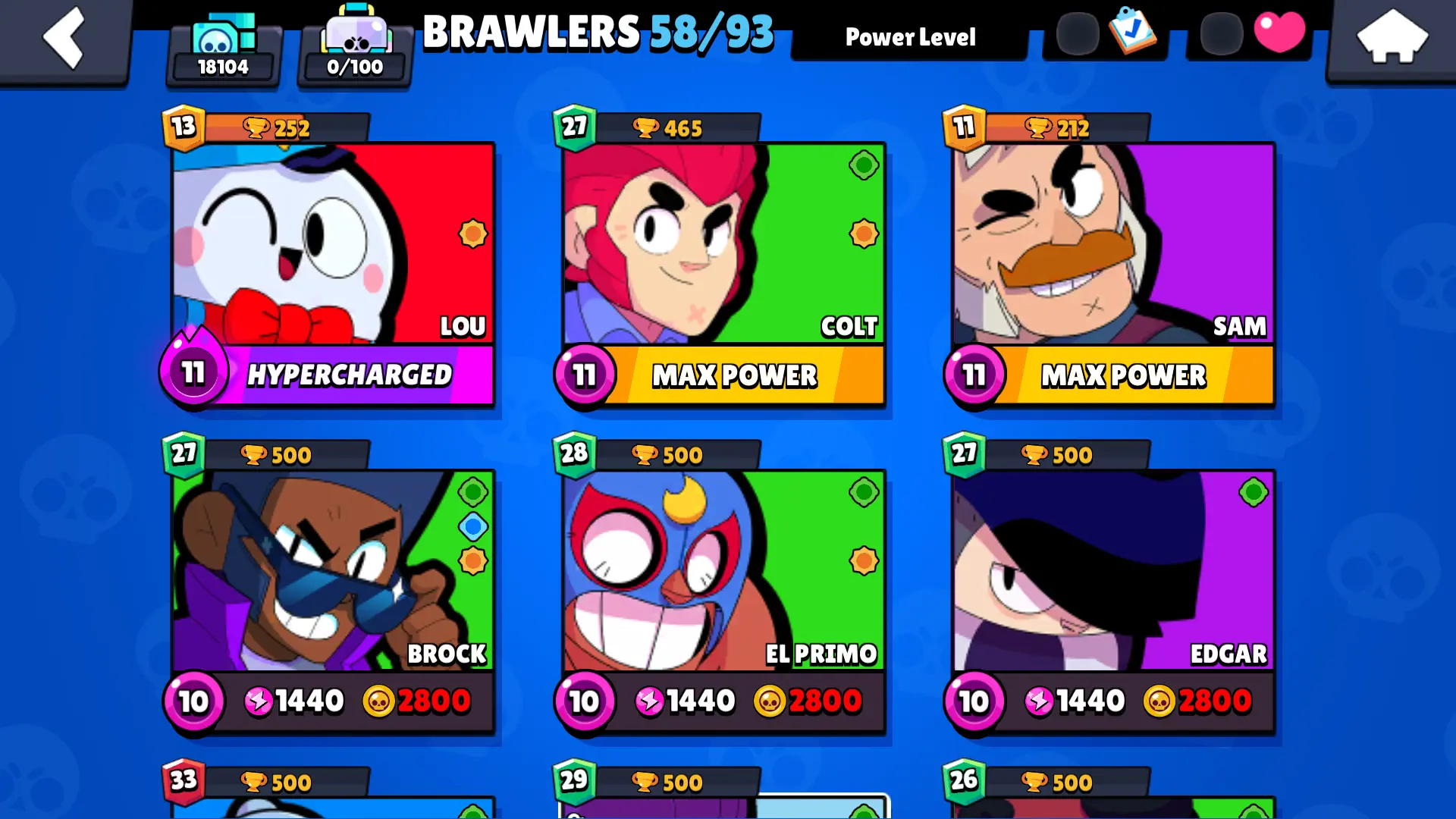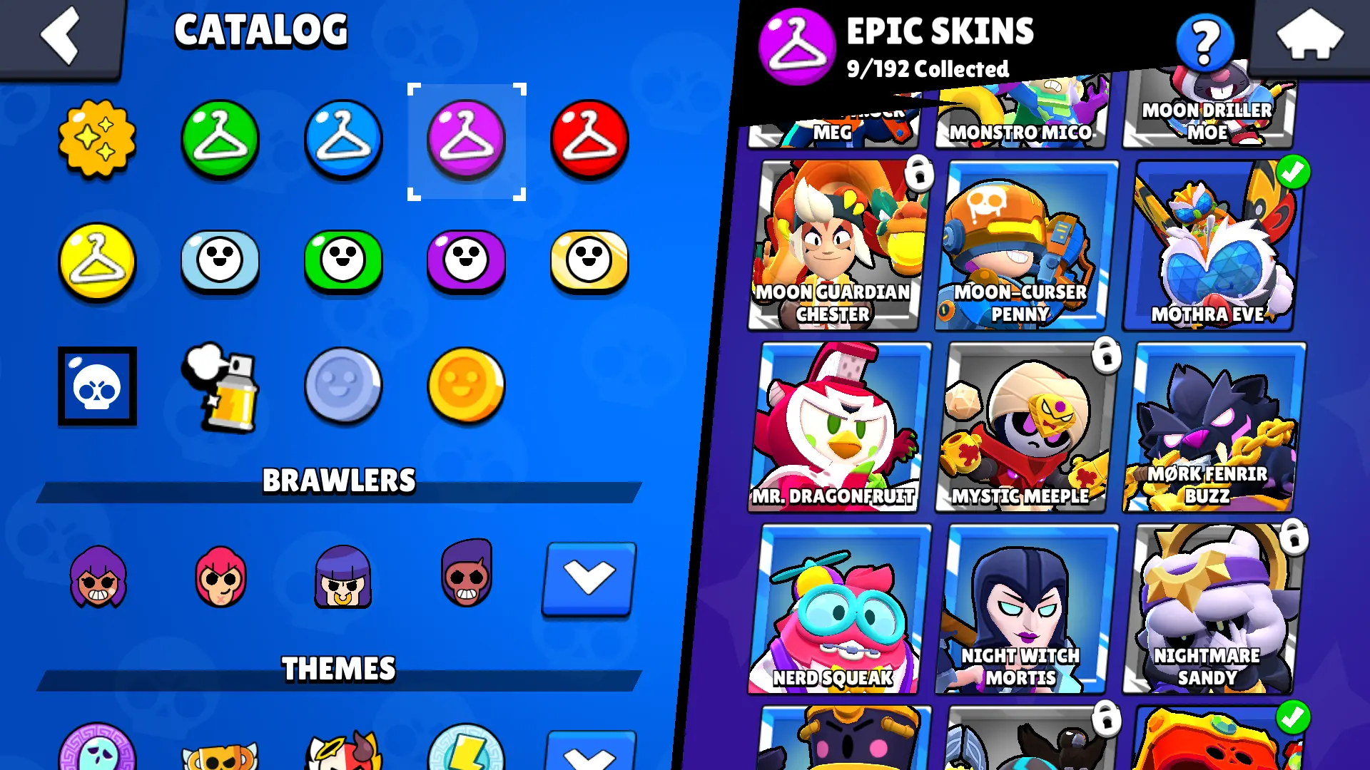56 SKINS | 18104 TROPHIES | SUPER RANGER BROCK BLACK | WARRIOR BO | MARIPOSA PIPER | TECH MAISIE | SQUAD BUSTER SHELLY | DYNASTY MIKE | ZOMBROCK | GUARD RICO | DUMPLING DARRYL | MOTHRA EVE | BEACH TIME MORTIS | DINO LEON | DARUMA MR. P | 58 BRAWLERS
