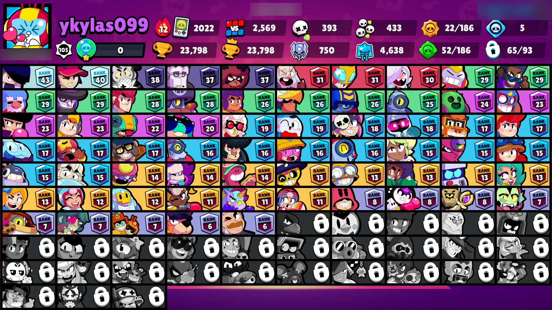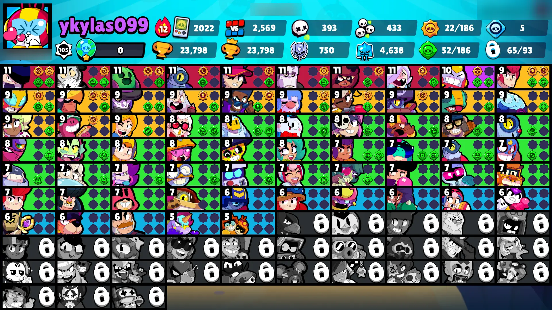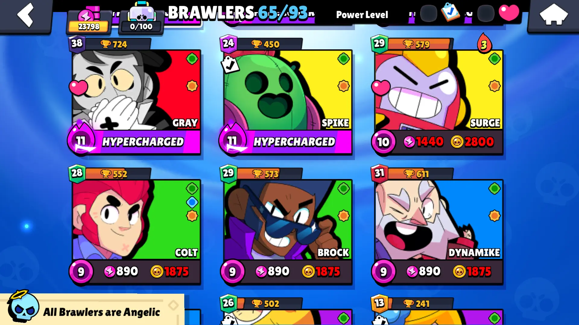 90 SKINS | 23798 TROPHIES | FILMMAKER BUZZ | GODZILLA BUZZ | DARK LORD SPIKE | SURGE LIGHTYEAR | SUPER RANGER BROCK BLUE | SUPER RANGER BROCK PINK | HORUS BO | SANTA STU | VANARA FRANK | IVY BELLE | SHELL BLASTER GALE | IMPIE COLETTE | 65 BRAWLERS