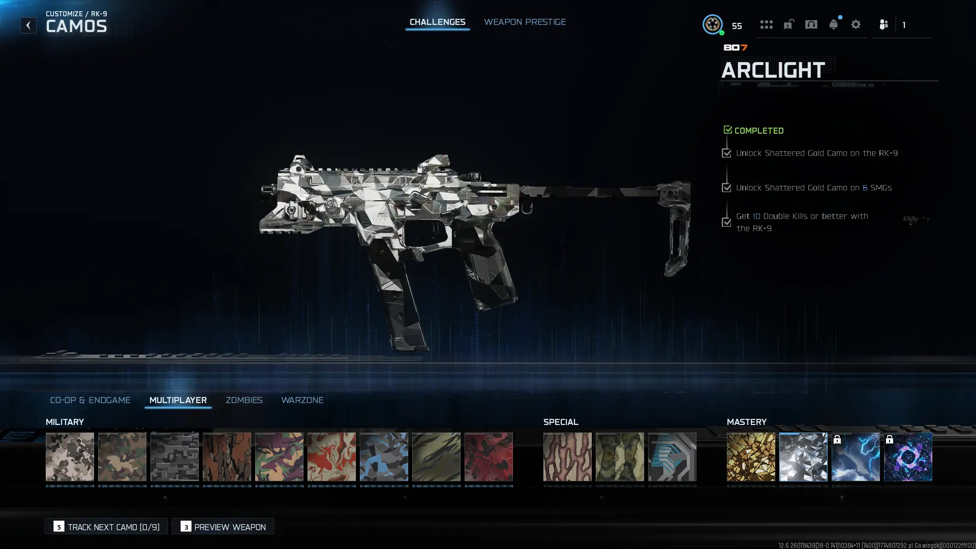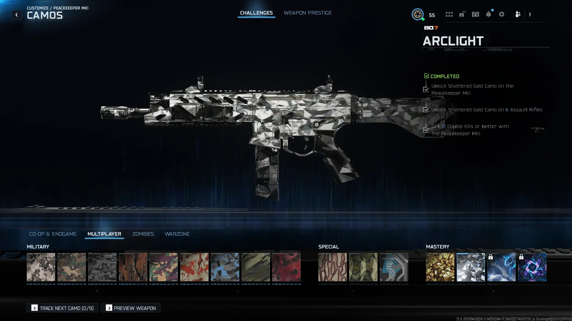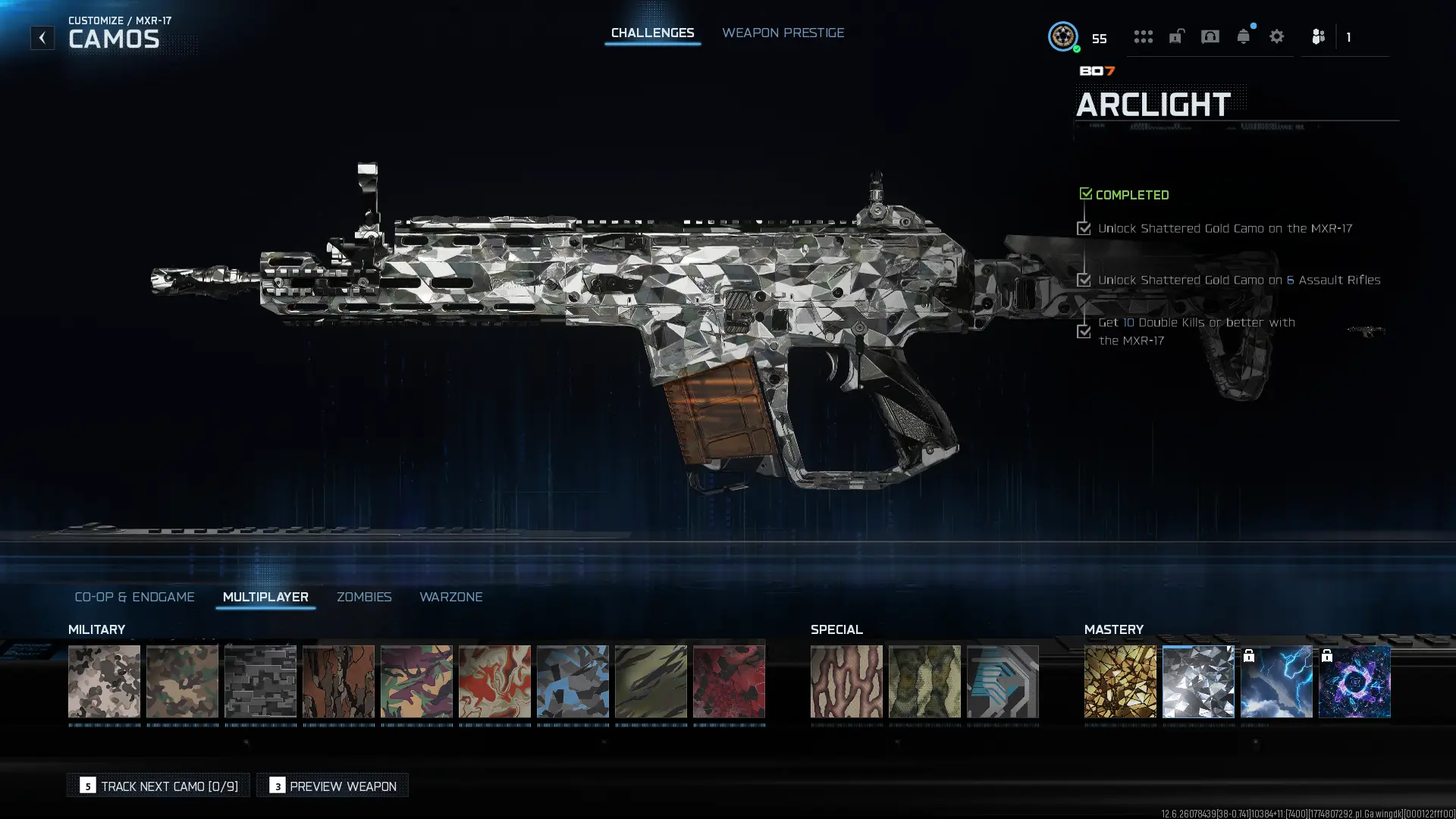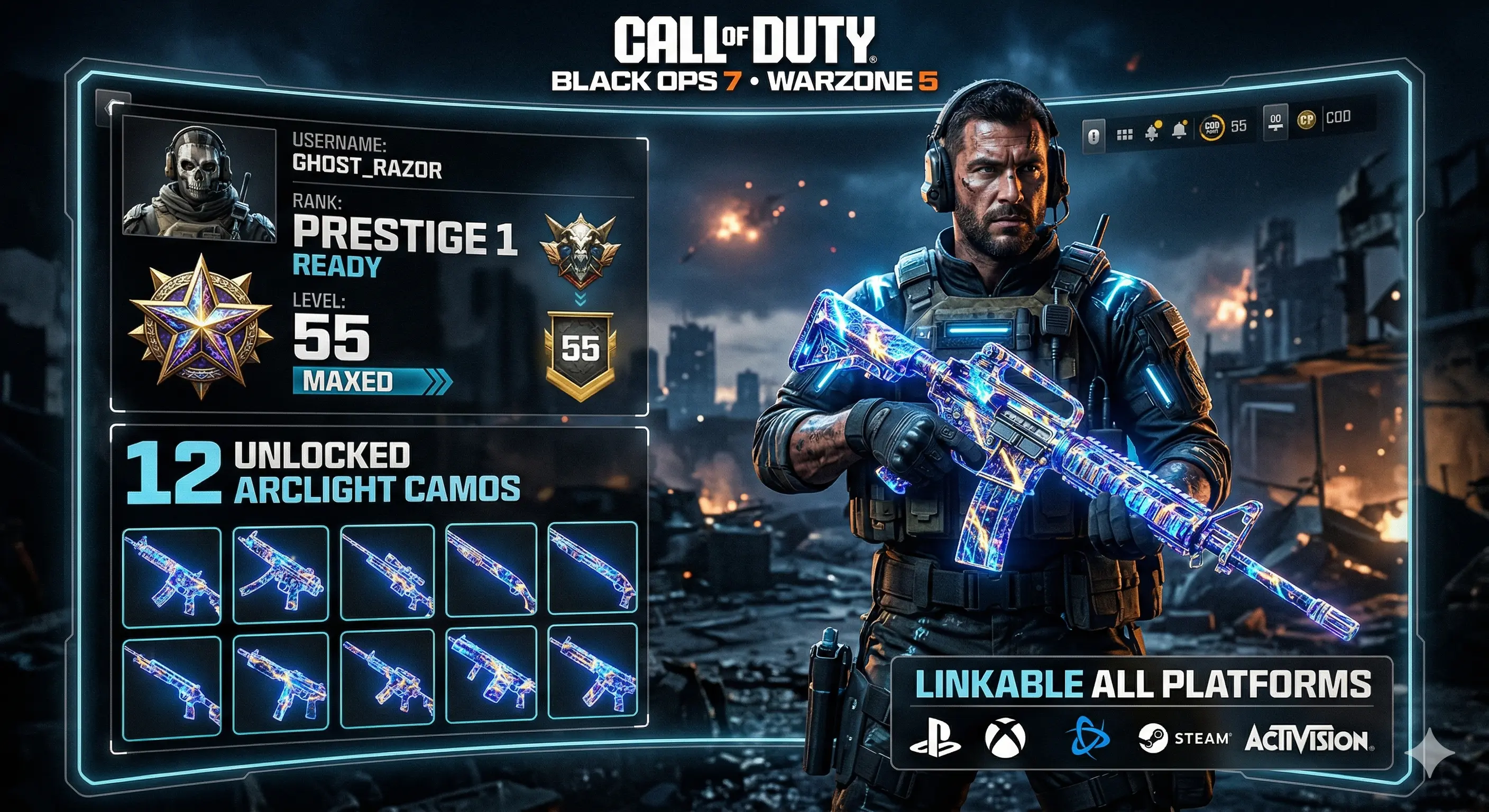 【☢️ Black Ops 7 • Warzone 5 ☢️】【12 Arclight Camo + Prestige 1 Ready】 ☣️ Linkable All Platforms | Random Guns Maxed | Arclight Legit | 12x Arclight | Level 55 lvl 55 ⸱ Arclight Prestige 1 | BO7 | Black Ops 7 | Shattered Gold
