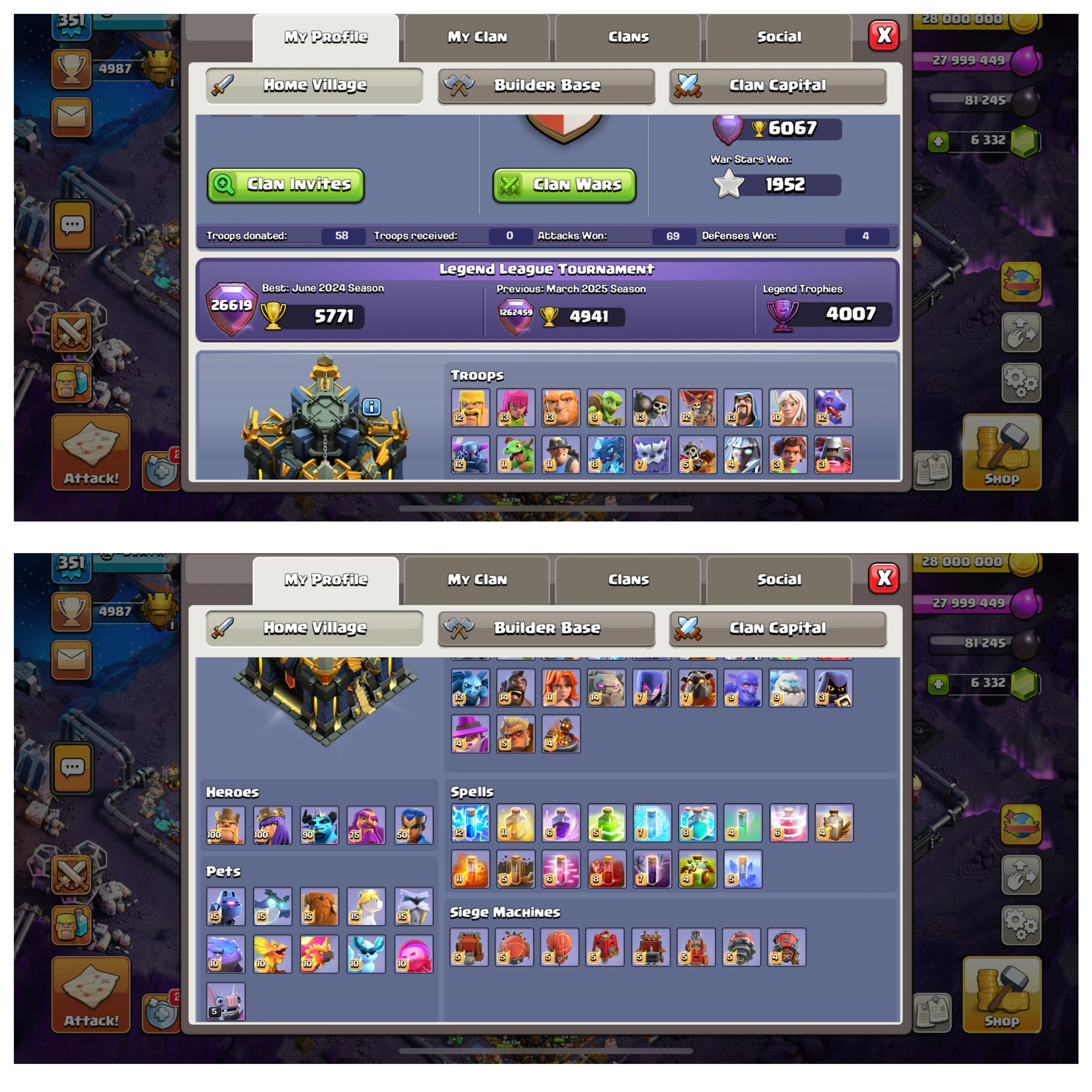 MOST RAREST ✅ TH 17 FULL MAX 100% BOTH VILLAGE ✅ XP-351 (HIGH XP LEVEL) ✅ CLASH OF DRAGON ✅ EPIC-11 ✅ GG & FA MAX, SB-26, FB & EB-23 ✅ 10x PETS & 05 HEROES MAX ✅ PLEASE READ DESCRIPTION ✅ ANDROID & IOS