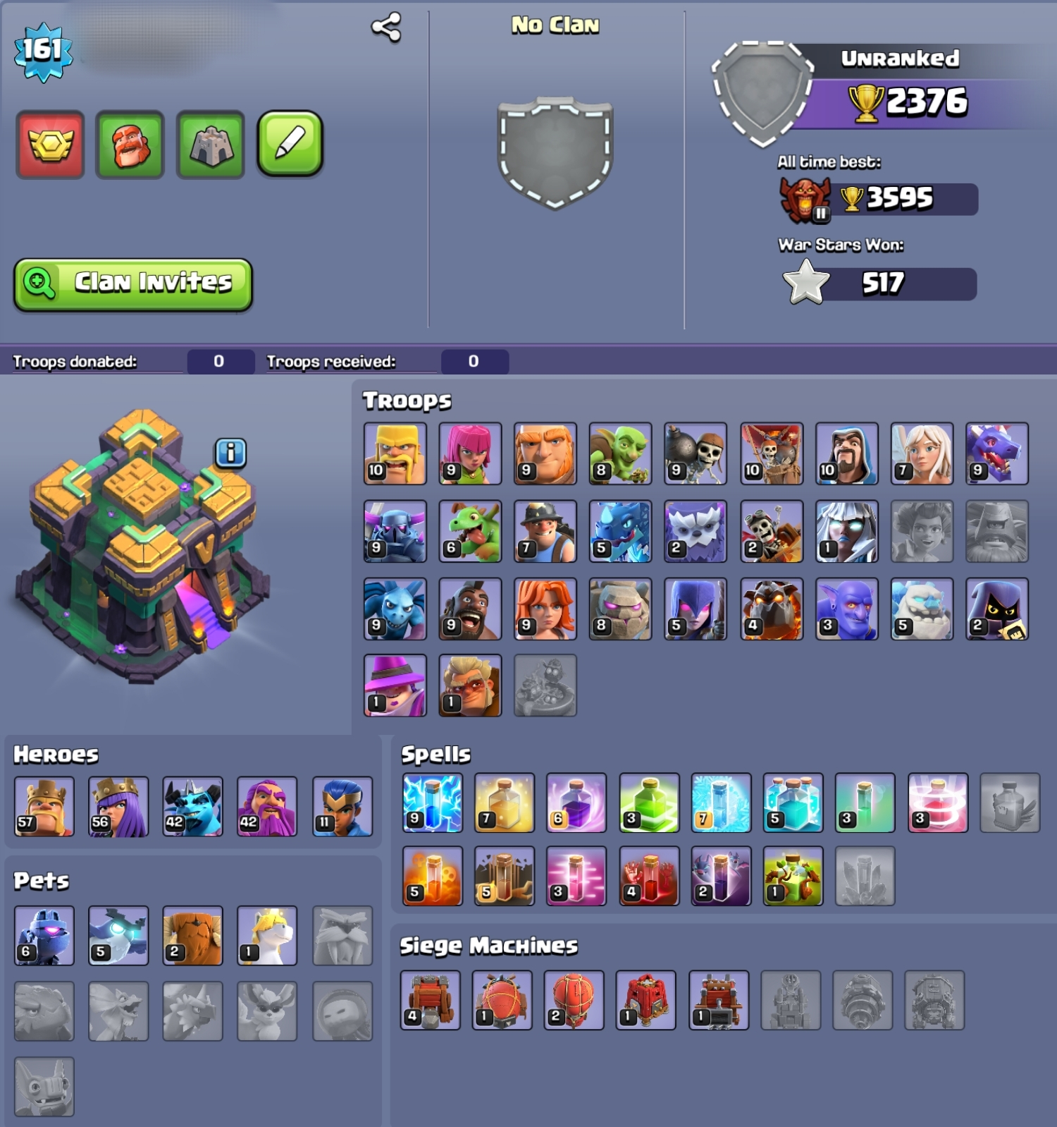 ❄TH 14 ACC 💢 EPIC EQUIPMENT ❤🔥 HEROES 57_56_42_42_11 ✨ 161 XP LVL 💀 517 WAR STAR 🪛456 CWL & 2438 RAID MEDALS 🍀 NC 500 💎 OP HEROES SKINS 🌀 ATB 3191 ❄ INSTANT DELIVERY📮