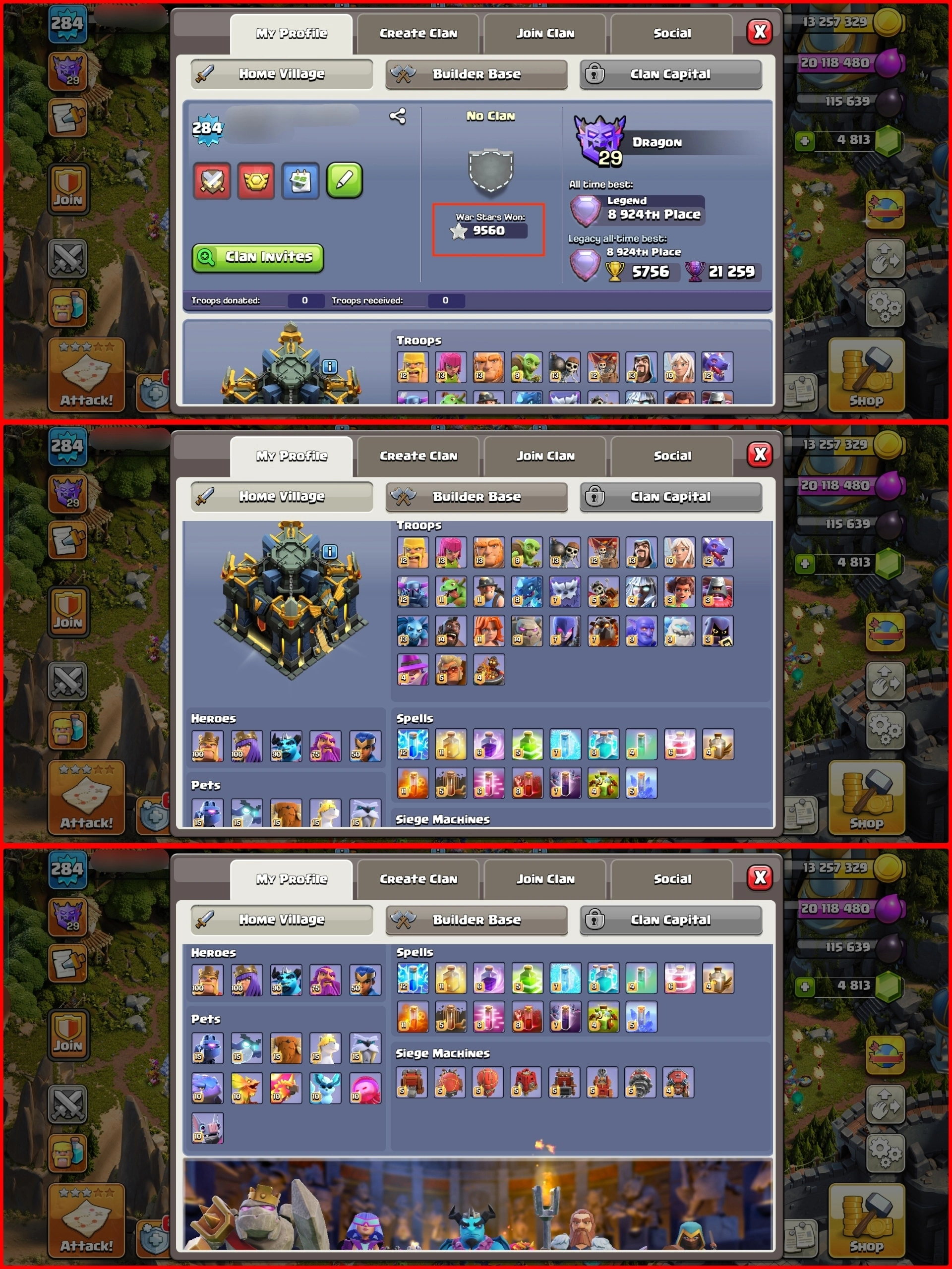 World Most prestigious 9560 War Stars [ Soon 10k WS ] TH17 Both Side Max | Maxed Hero Equipments, ALL 2500 Medals & 284 EXP