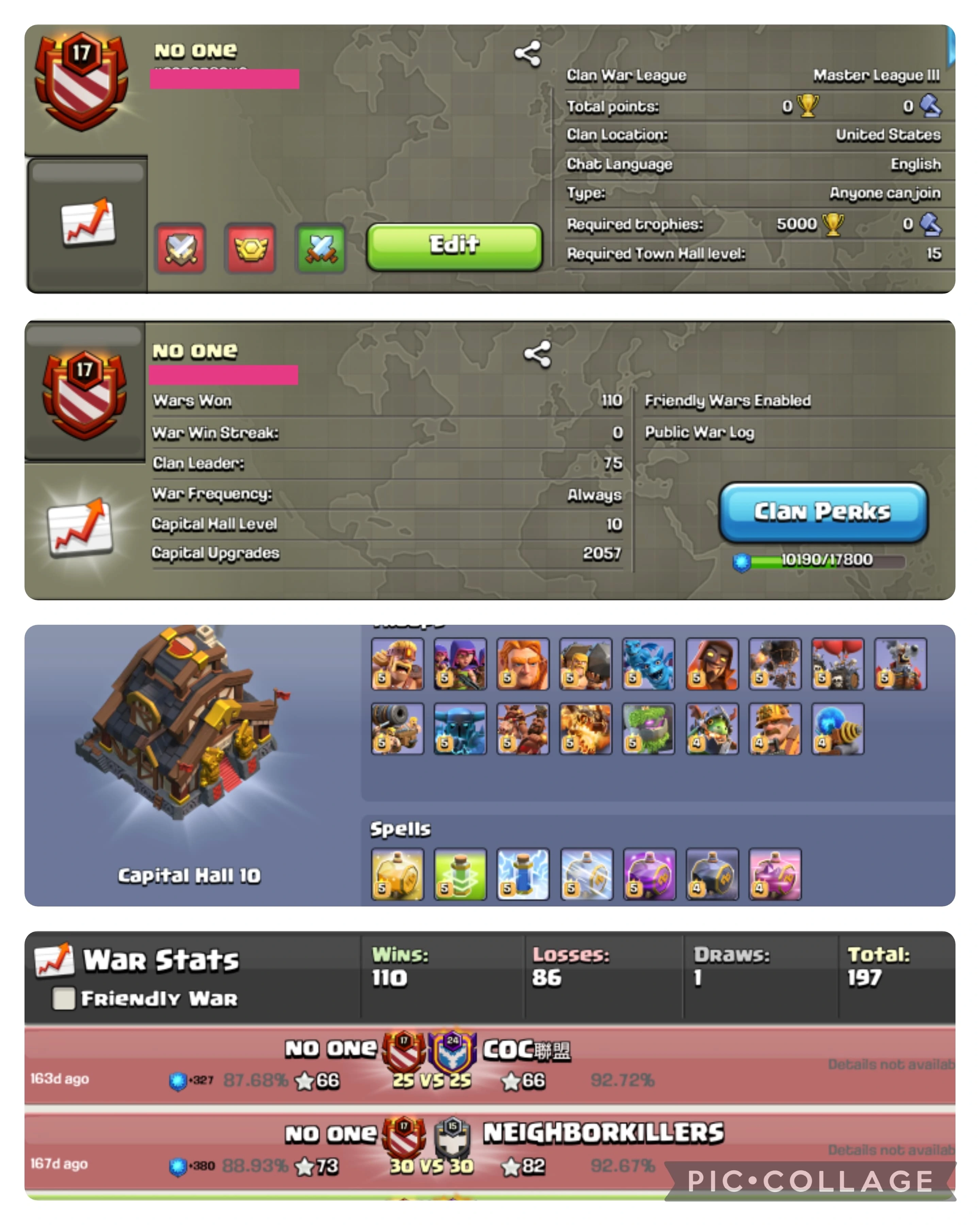 😊MASTER 3 + CC 10 😝FRIENDS FOREVER 💝 LEVEL : 17.5 💞WAR WINS 179 ,LOSSES 92 ,DRAW 1 🤓