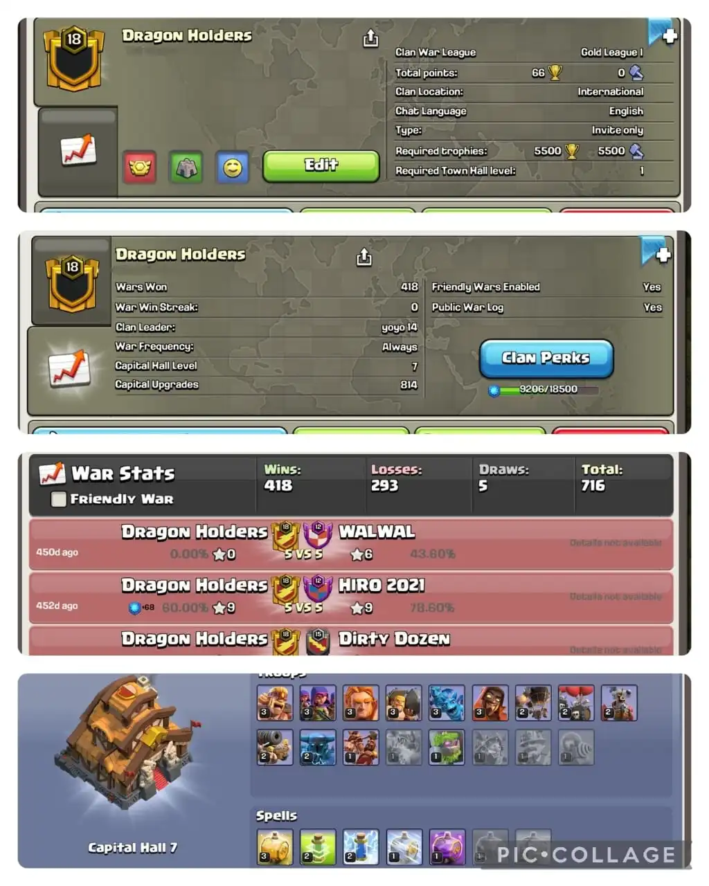 🔥NAME- DRAGON HOLDERS | LVL 18🥵| 💥WARLOG W/L/D:418/293/5| CWL League: GOLD 1🏆| CC: ALMOST 8 !!💥