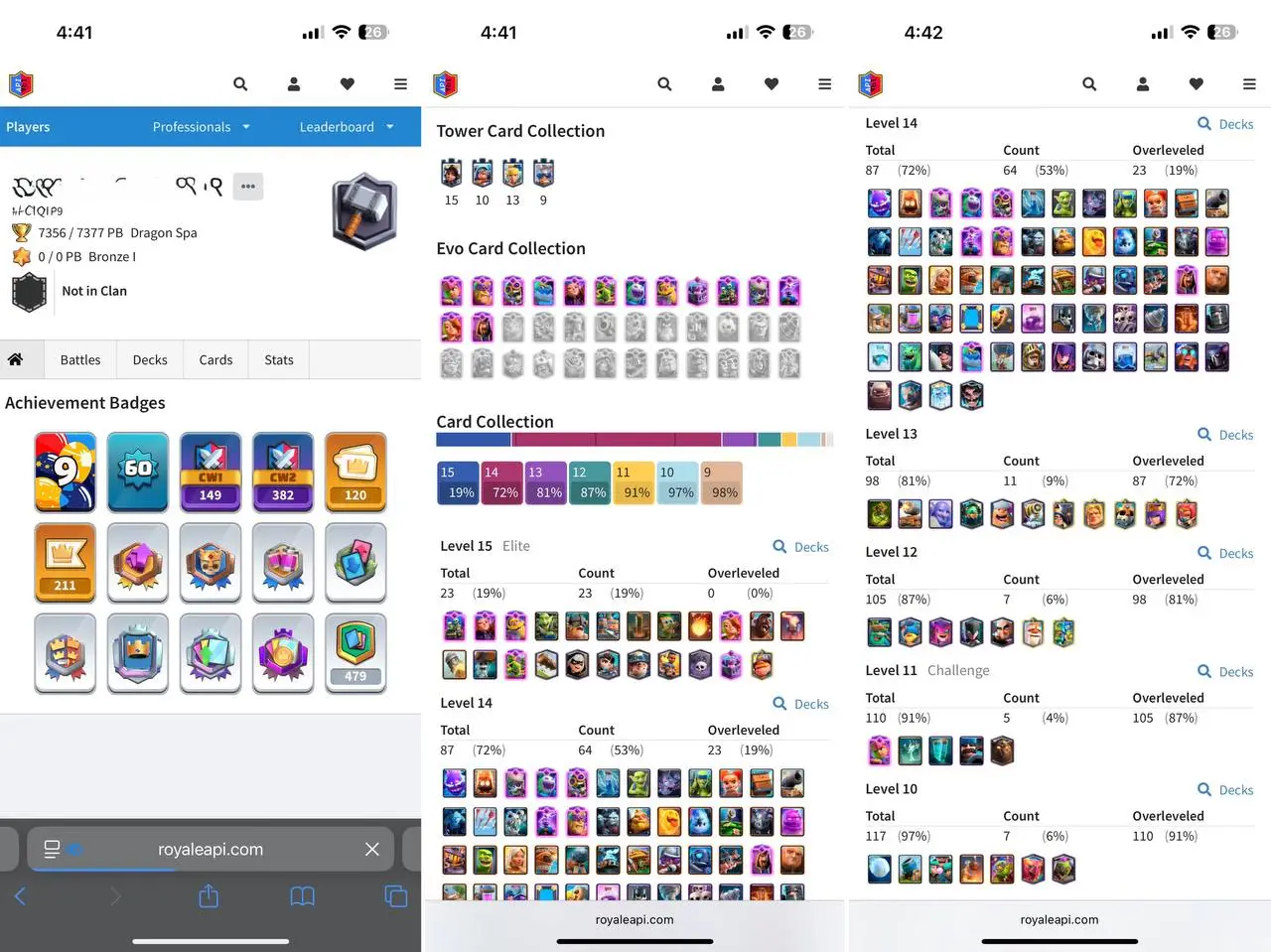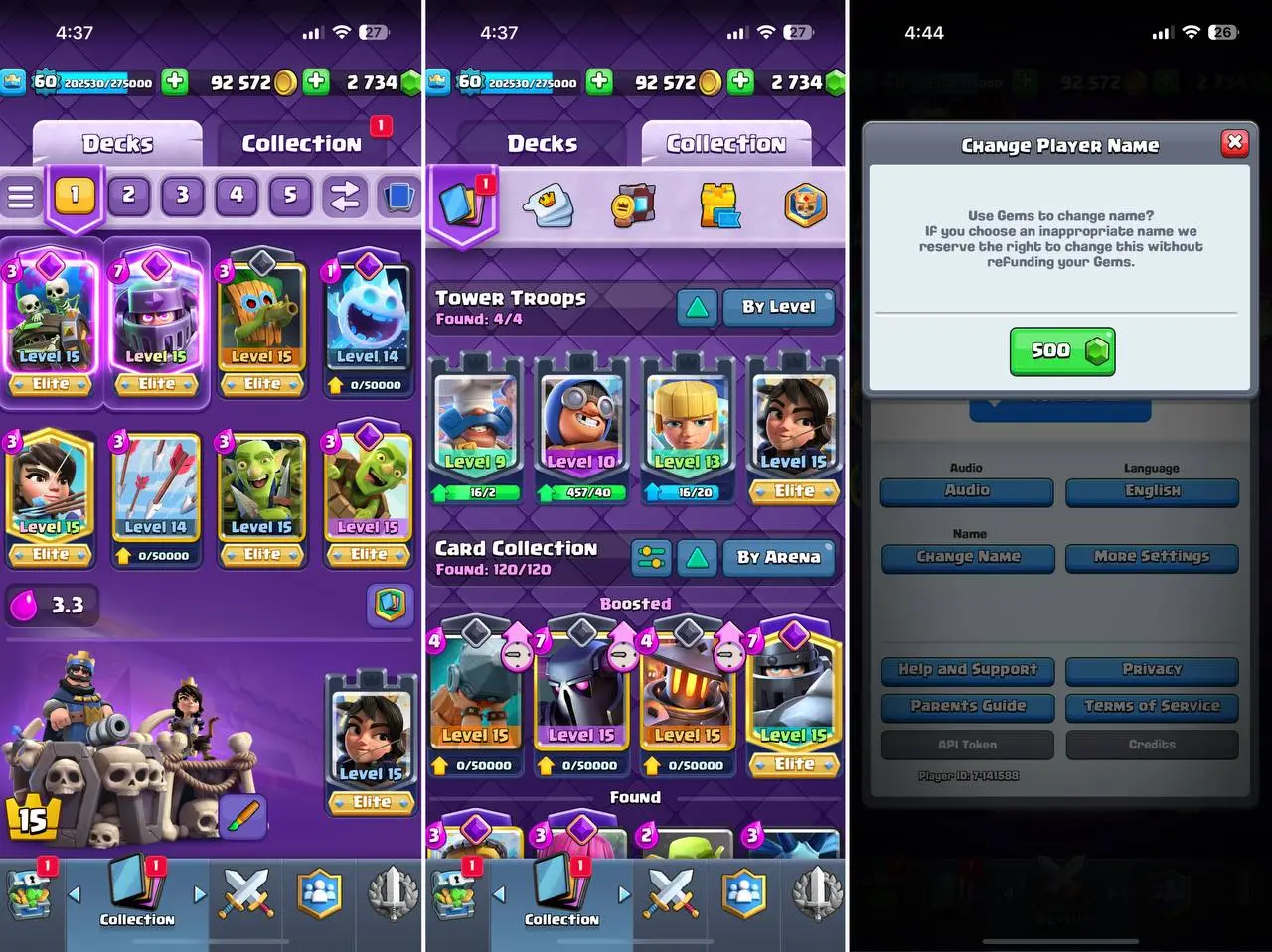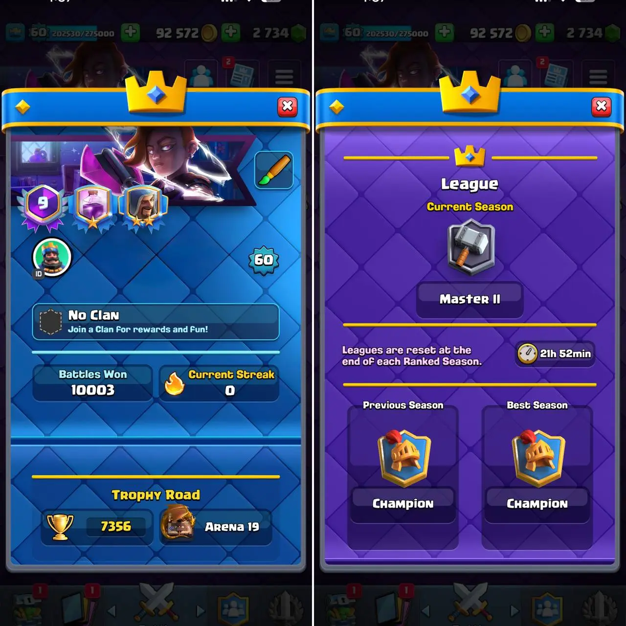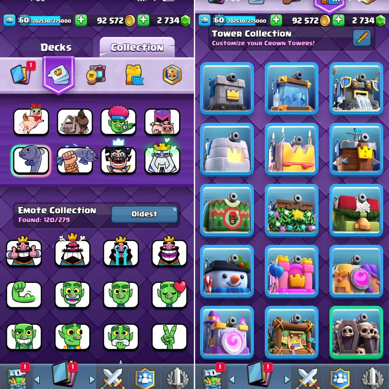 0p🎖 9 YEAR BADGE 💥 87 MAX CARDS 🔹 ARENA 19 ⚔️ 23 ELITES 🔹 14 EVOS 🏆 7356 TROPHIES 📈 XP60 🏰 KT15 💎 2734 GEMS 😀 120 EMOTES ⚡️ INSTANT