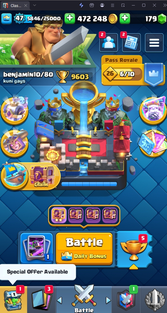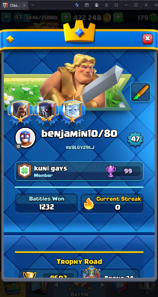9603 TROPHY 🏆 47 LVL 💯 KT 14 👑 119 CARDS ♦️ 6 MAX CARDS 👑 3 ELITE CARDS  🔮 9 EVO 💯 EMOTE 43 🎭 #V8LGY29LJ ⸱ TAG ACCOUNT ♥️