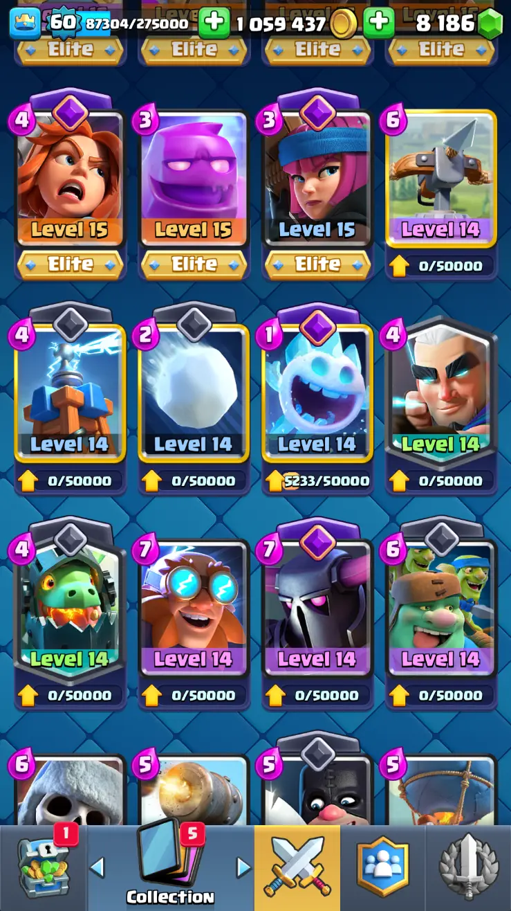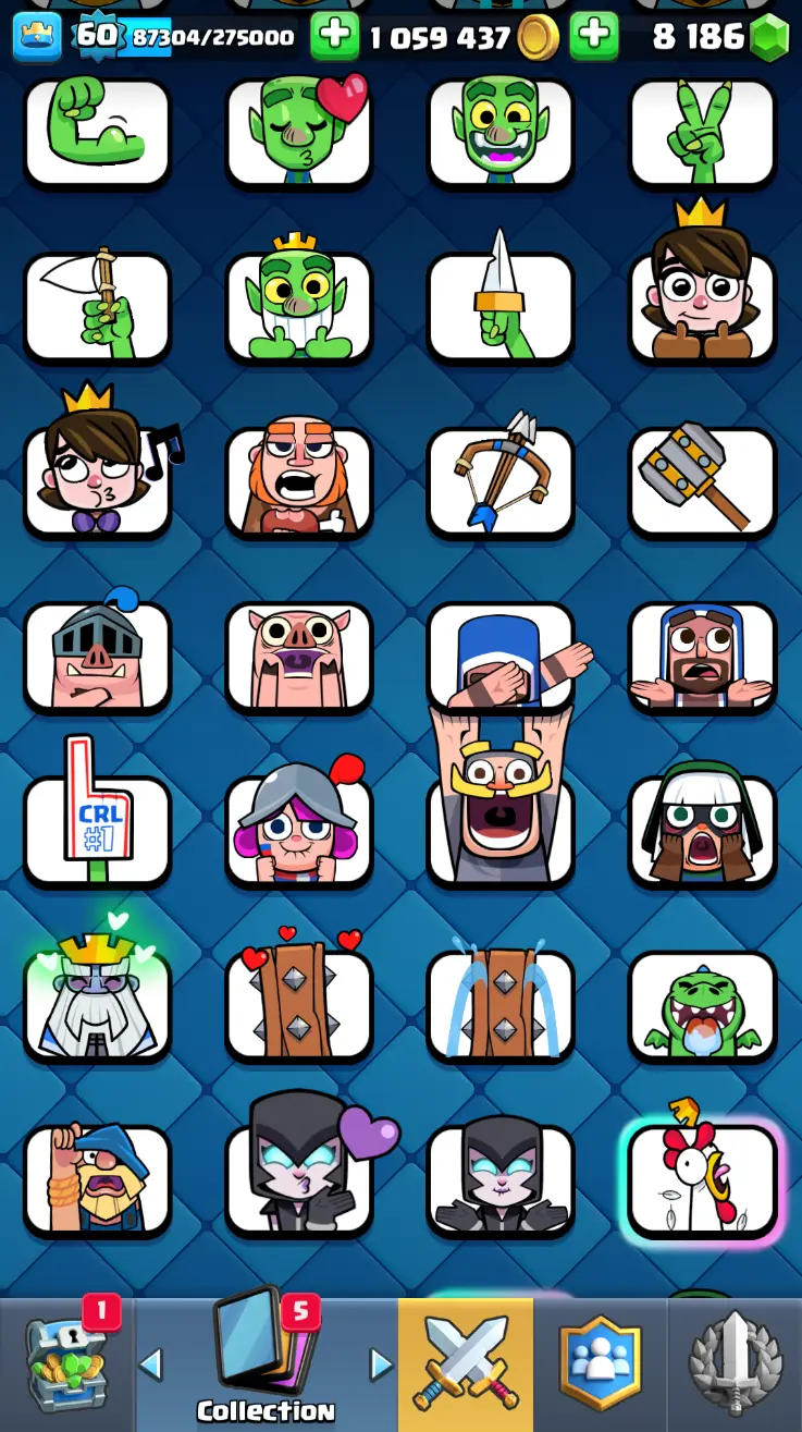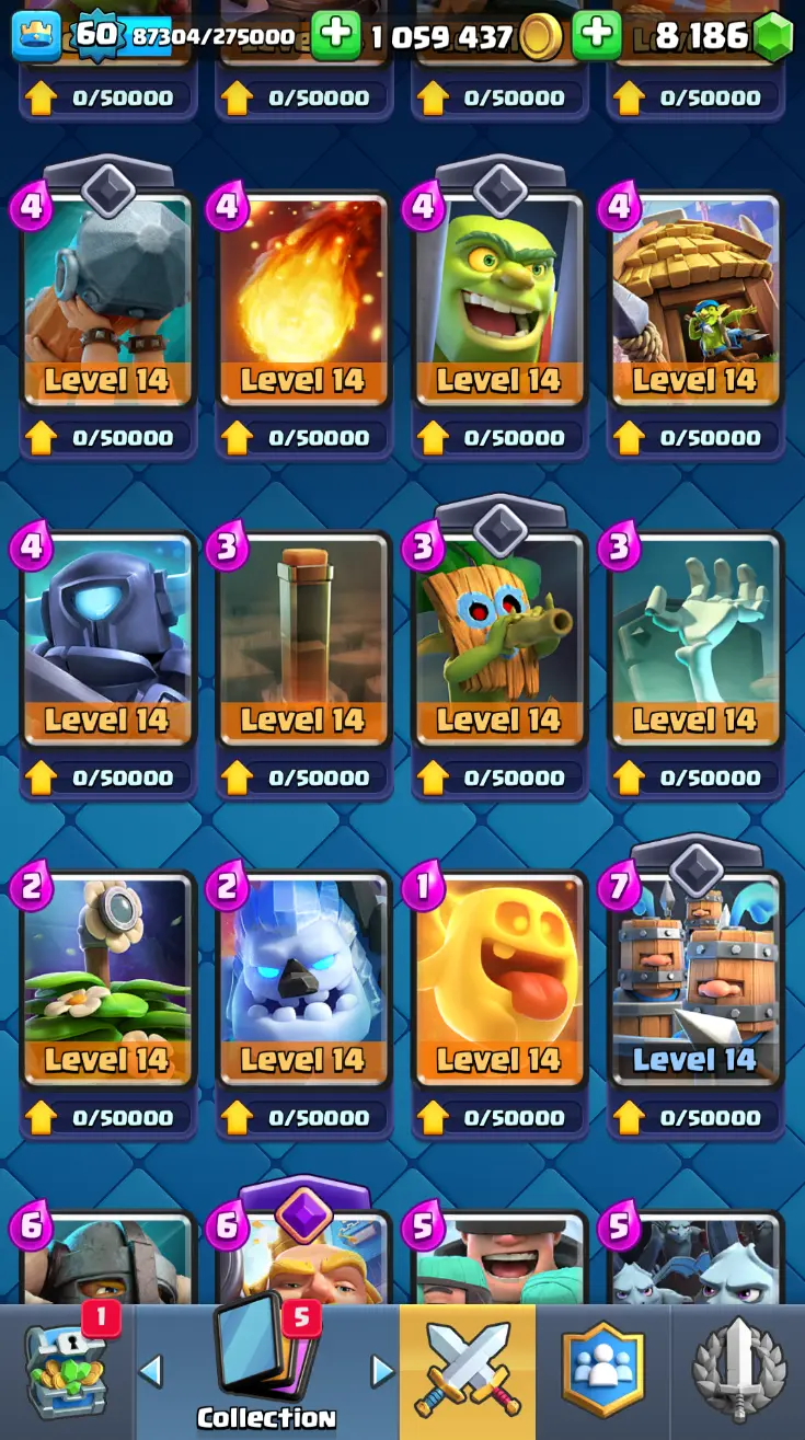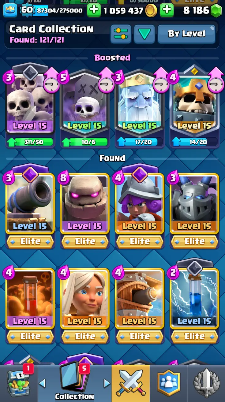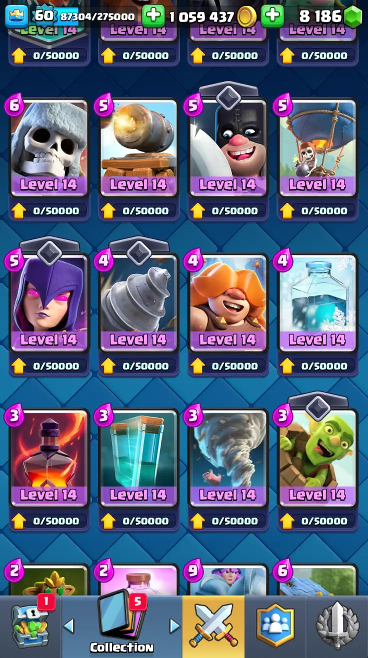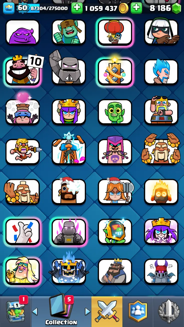 ◀️ KT 15 ▶️ LEVEL 60 🤩 12150 TROPHIES 🏆 23 ELITE CARD 🙀 67 MAX CARD 😎 15 EVO ☠️ 91 EMOTE 😍 10 SKIN 👽 121 CARDS 💳 1m GOLD 💰 8186 GEMS 💎 RL145