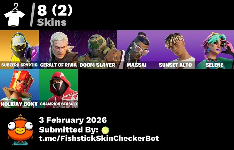 ăPC/PSN/XBOXă8 Skins | Subzero Cryptic | Geralt of Rivia | Doom Slayer | Massai | Sunset Alto | Selene | Holiday Boxy | Champion Stash'd | Cryptic Sling-kit | 300 VB | FS23