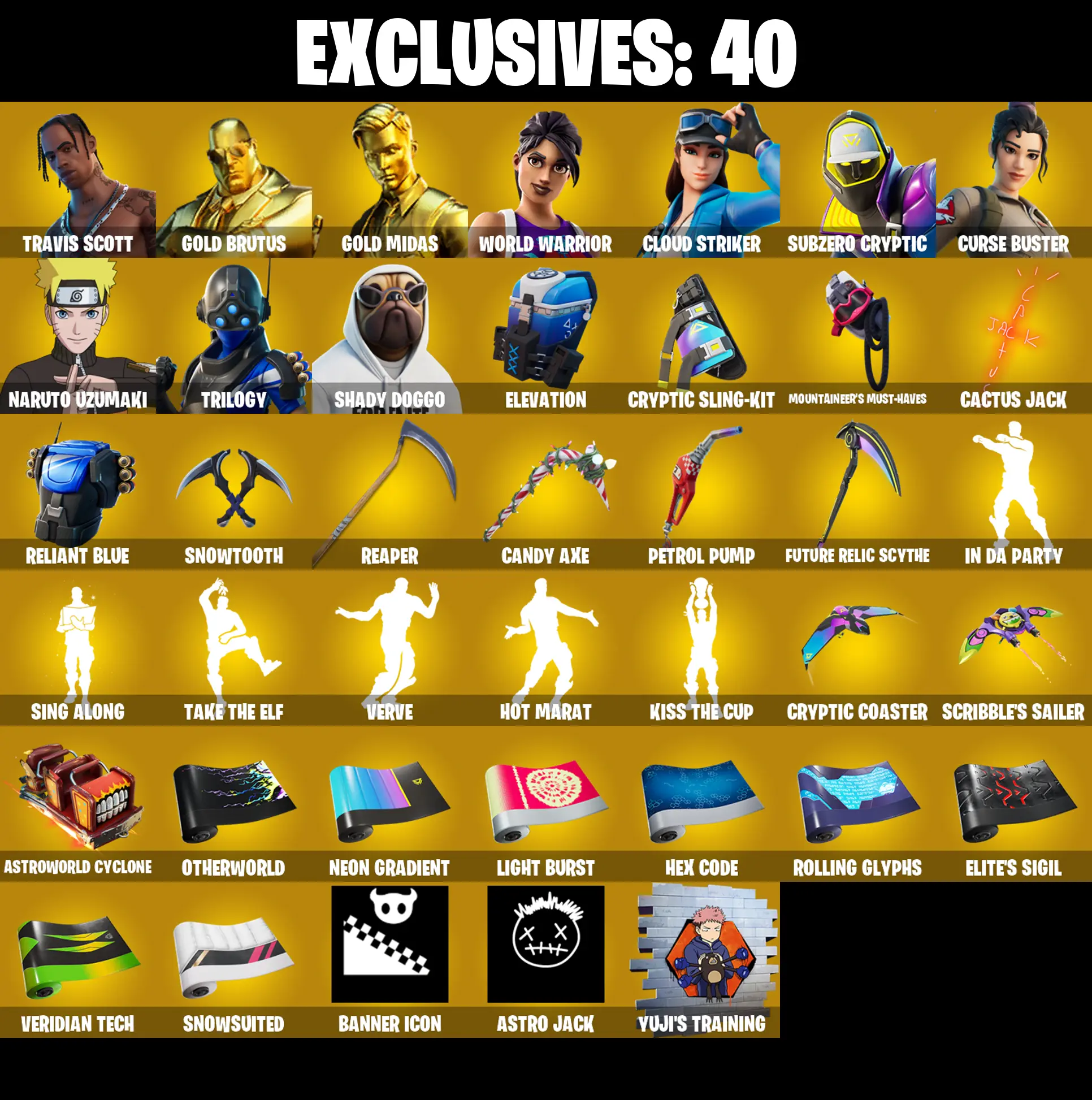 228 SKINS ✨ Travis Scott ✨ Gold Brutus ✨ Gold Midas ✨ World Warrior ✨ Cloud Striker ✨ Subzero Cryptic ✨ Curse Buster ✨ Naruto Uzumaki ✨ Trilogy ✨ 500 VB (PC/PSN/XBOX)