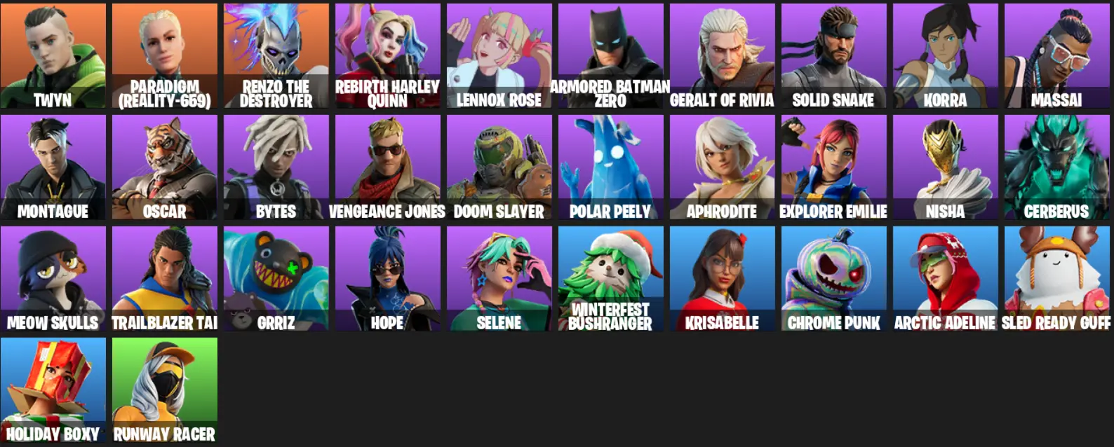 32 skins | Paradigm (Reality-659) | Renzo the Destroyer | Twyn | Polar Peely | Geralt of Rivia | Solid Snake | Doom Slayer |
