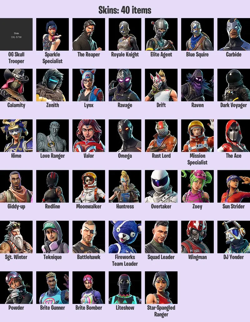 40 Skins|OG Skull Trooper|Sparkle Specialist|The Reaper|Royale Knight|Elite Agent|Blue Squire|Carbide|Calamity|Zenith|Lynx|Ravage|Drift