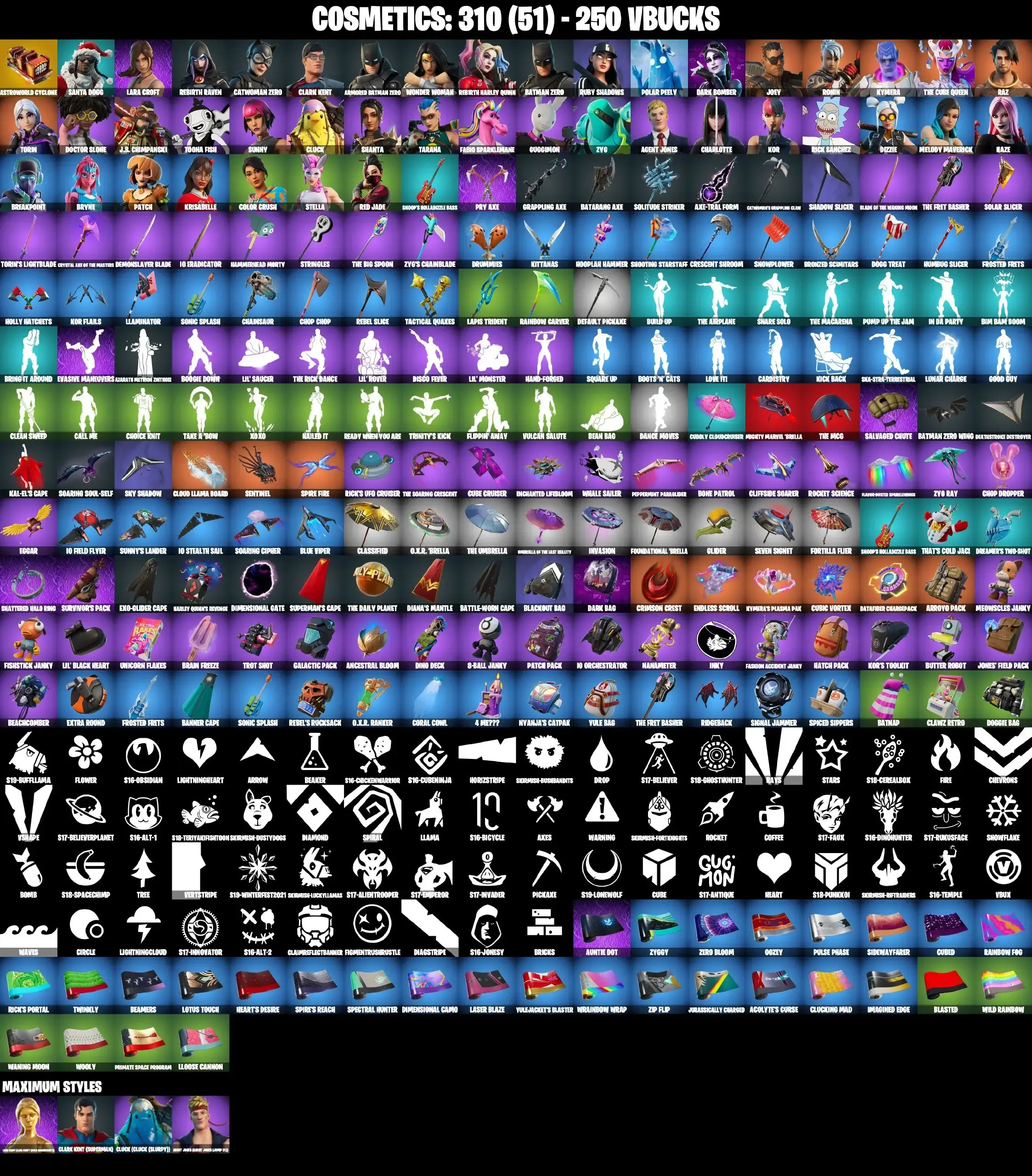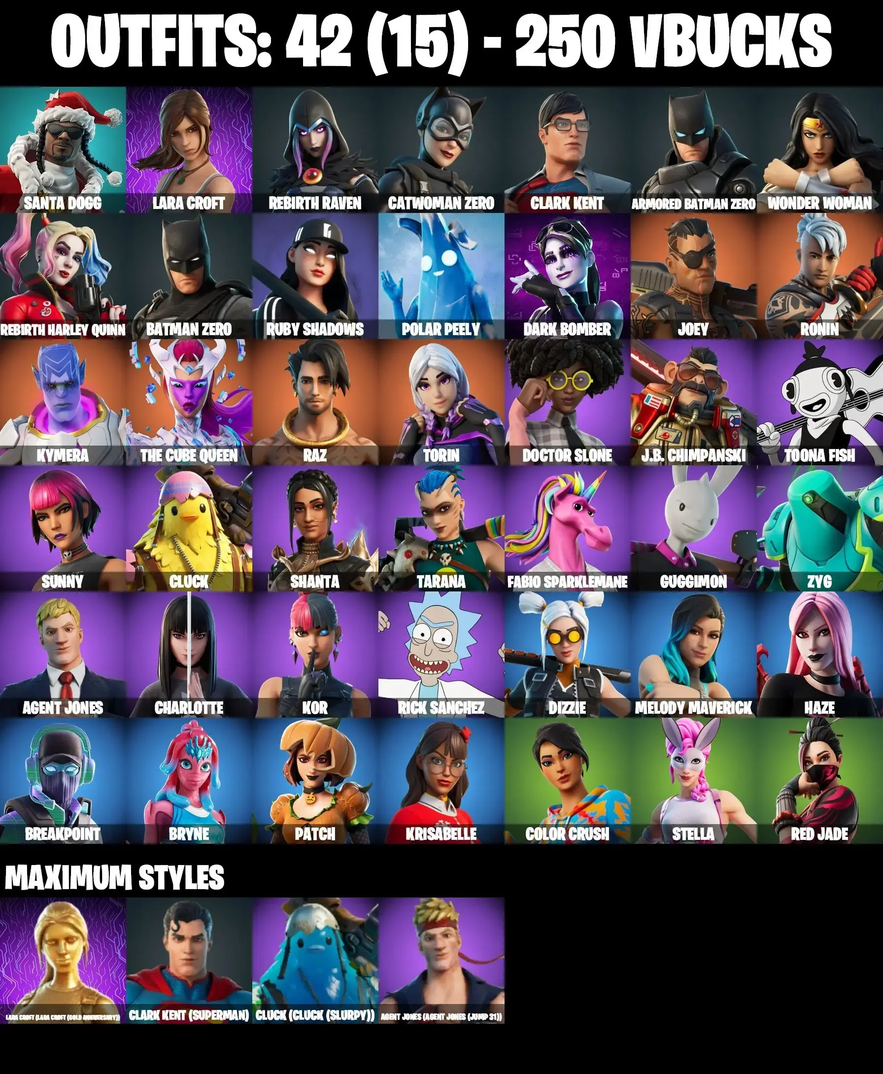 42 SKINS | GOLDEN LARA CROFT | CATWOMAN ZERO | REBIRTH HARLEY QUINN | ARMORED BATMAN ZERO | WONDER WOMAN | CLARK KENT SUPERMAN | CHARLOTTE | KOR | ASTROWORLD CYCLONE | CAN PLAY ON PSN,XBOX,PC,NINTENDO,MOBILE | 250 VBUCKS | FULL EM