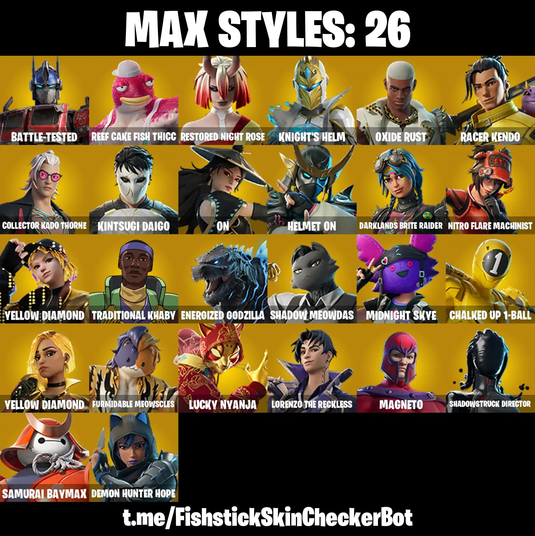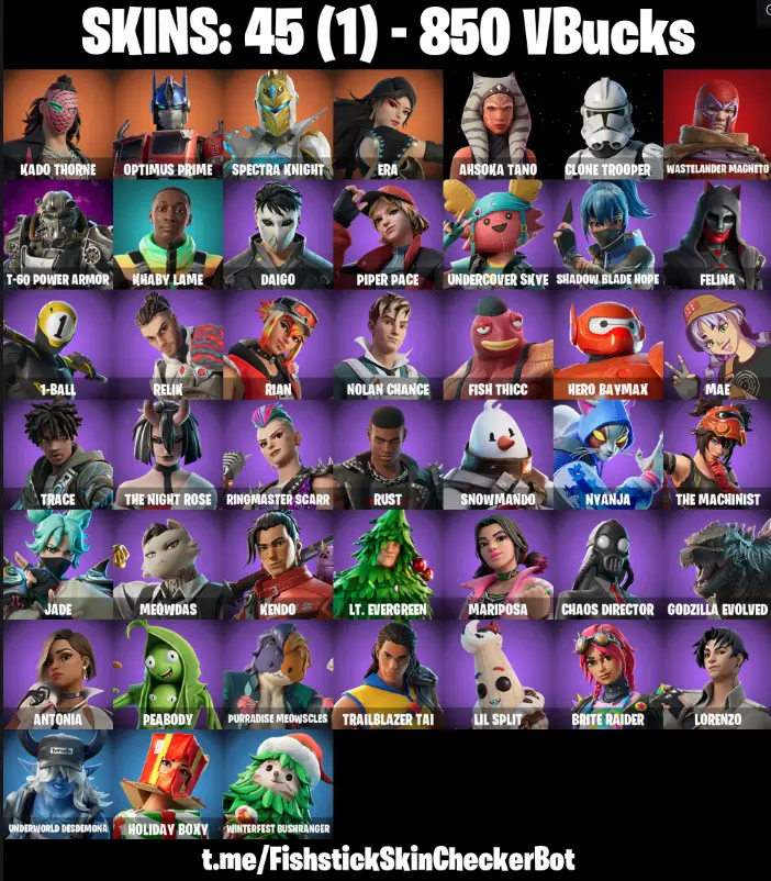 ⚡ 45 Skins [PC/PSN/XBOX] 🏰 Kado Thorne 🚛 Optimus Prime 🛡️ Spectra Knight 🌅 Era ⚔️ Ahsoka Tano 🪖 Clone Trooper 🧲 Wastelander Magneto ⚙️ T-60 Power Armor 💰 850 VBucks | AGCFN112