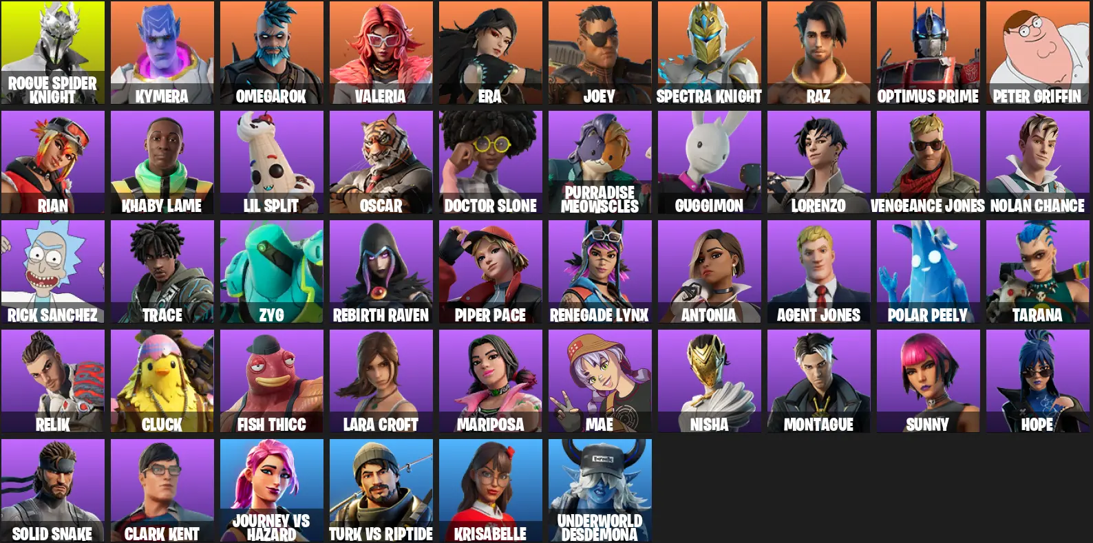 46 skins | Rogue Spider Knight | Omegarok | Peter Griffin | Valeria | Optimus Prime | Raz | Joey | Era | Spectra Knight | Kymera | 1050 VB