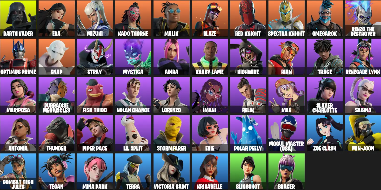 48 skins | Red Knight | Optimus Prime | Mizuki | Snap | Renzo the Destroyer | Spectra Knight | Malik | Kado Thorne | Omegarok | Era | Darth Vader