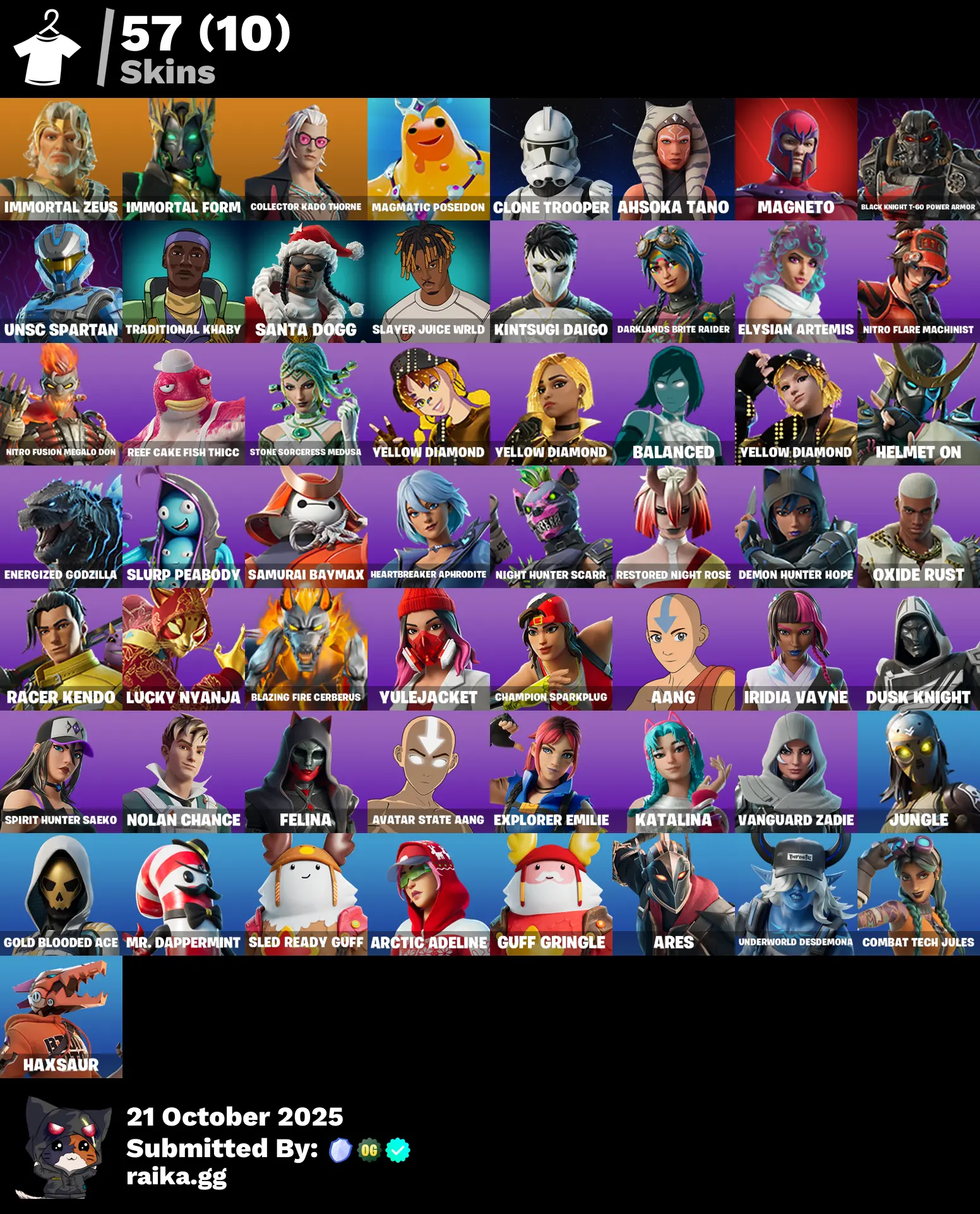 57 TOP SKINS AANG❤️SLAYER JUICE WRLD❤️BLACK KNIGHT T-60 POWER ARMOR❤️CLONE TROOPER❤️UNSC SPARTAN❤️SPIRIT HUNTER SAEKO❤️DUSK KNIGHT