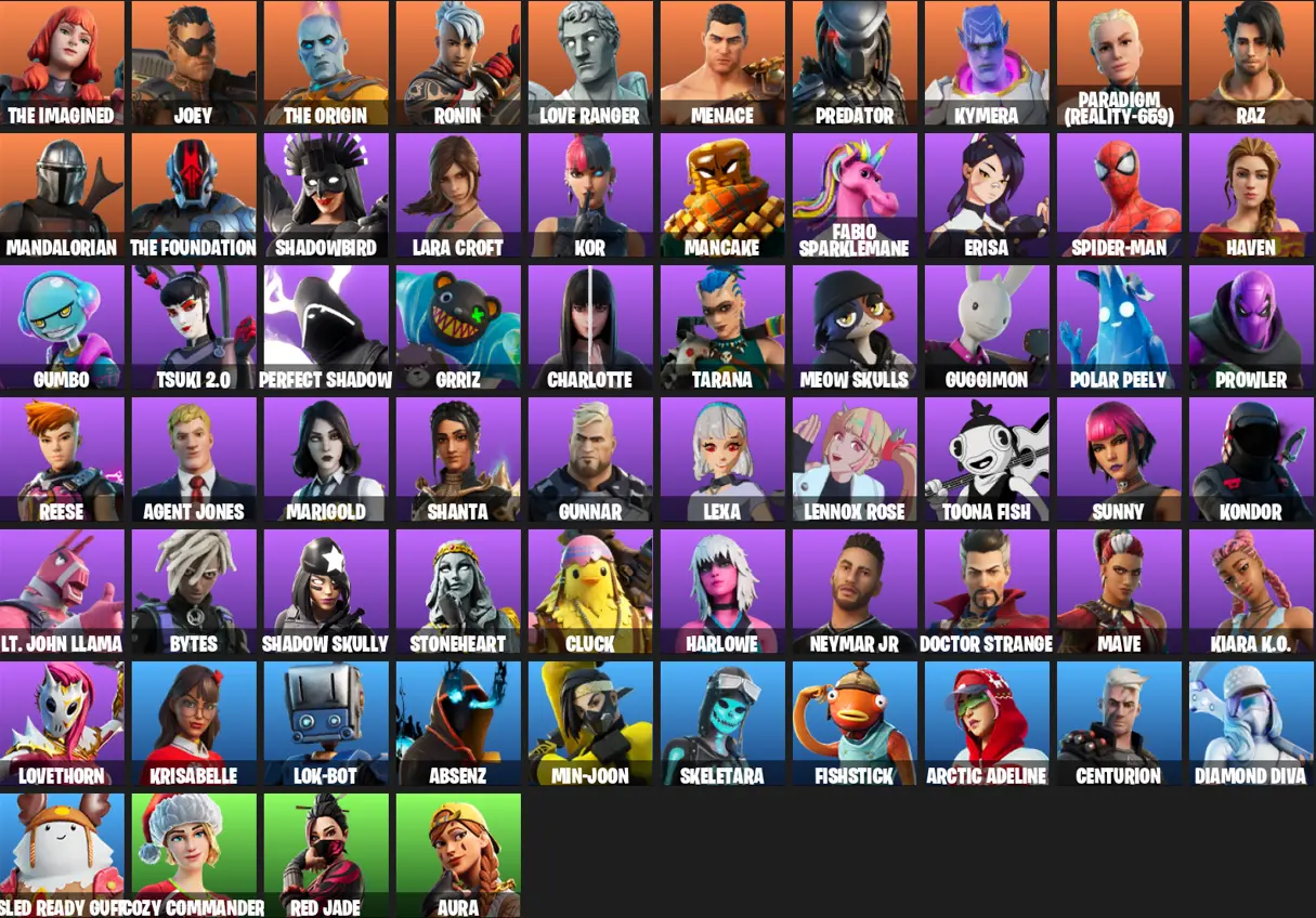 64 skins|Lara Croft|Paradigm (Reality-659)|Kymera|The Imagined|Menace|Joey|The Origin|The Foundation|Predator| Raz | Ronin | Love Ranger