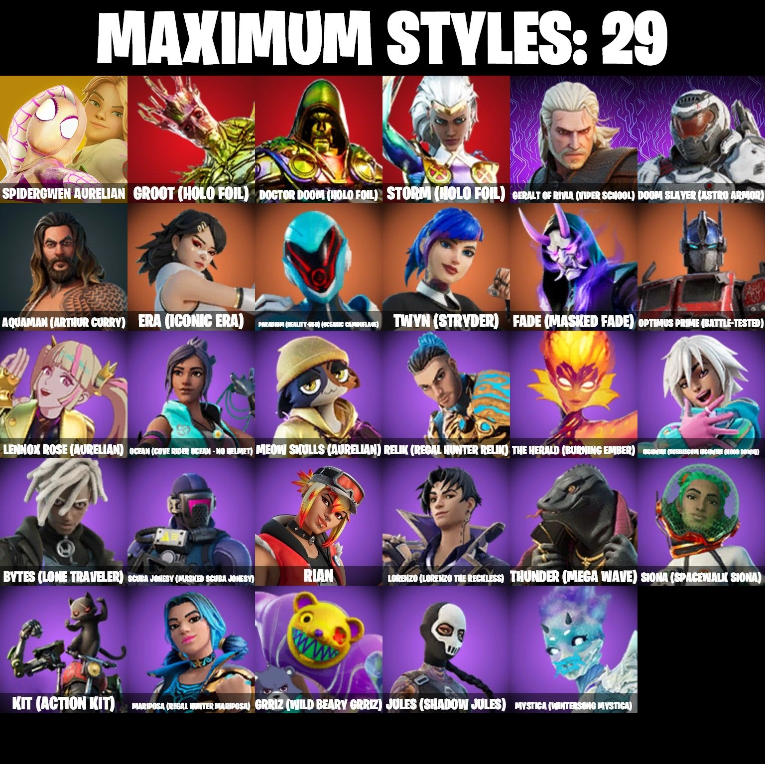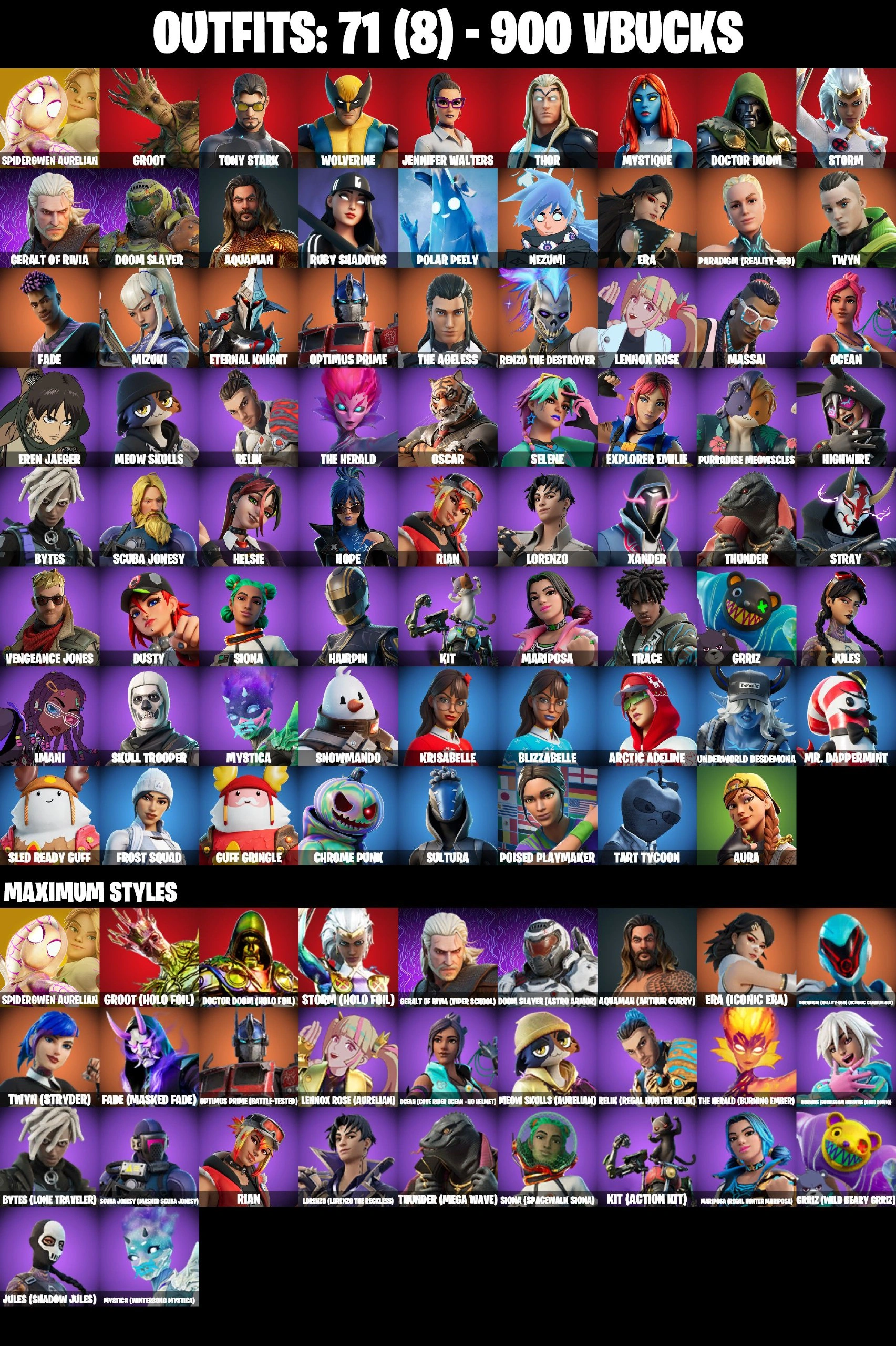 71 SKINS | HOLO FOIL GROOT | HOLO FOIL DOCTOR DOOM | HOLO FOIL STORM | SPIDER-GWEN STACY | SKULL TROOPER | EREN JAEGER | ERA MAX | MYSTICA MAX | MARIPOSA MAX | JULES MAX | AURA | HELSIE | MEOW SKULLS | POISED PLAYMAKER | ASTROWORL
