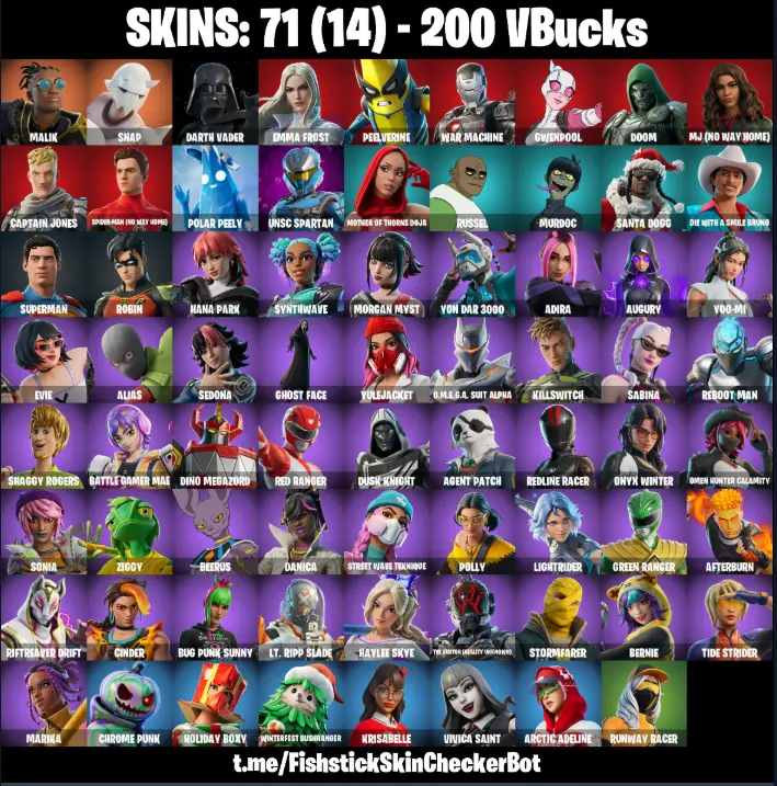 ⚡ 71 Skins [PC/PSN/XBOX] 🦸♂️ Malik ✋ Snap 🌌 Darth Vader ❄️ Emma Frost 🍌 Peelverine 💣 War Machine 🎨 Gwenpool 💀 Doom 🎬 MJ (No Way Home) 🧢 Captain Jones | AGCFN103