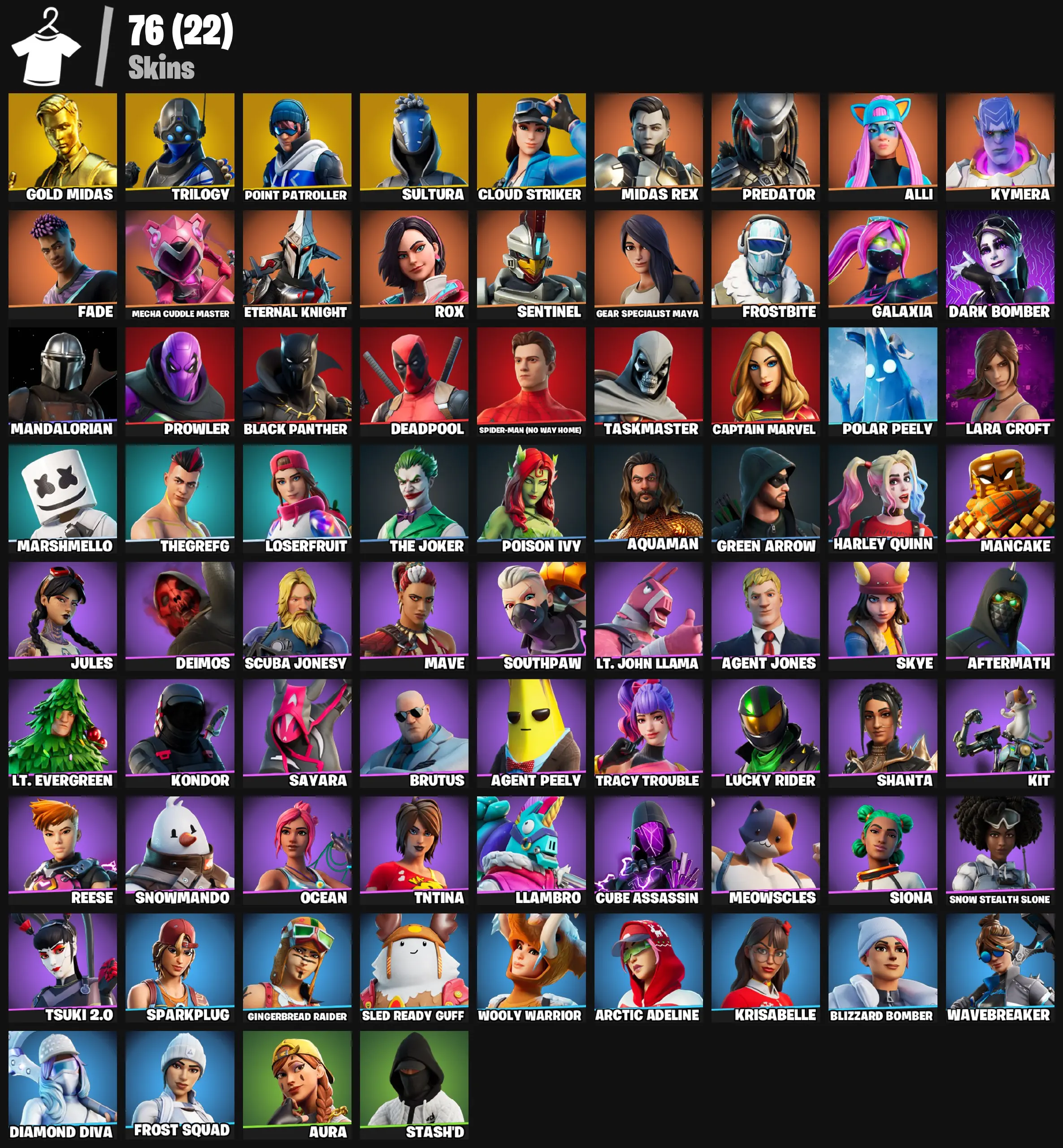 【76 SKINS】 (PC/XBOX) MARSHMELLO | DARK BOMBER | HARLEY QUINN | LOSERFRUIT | GALAXIA | THE JOKER | AURA | FROSTBITE | DEADPOOL