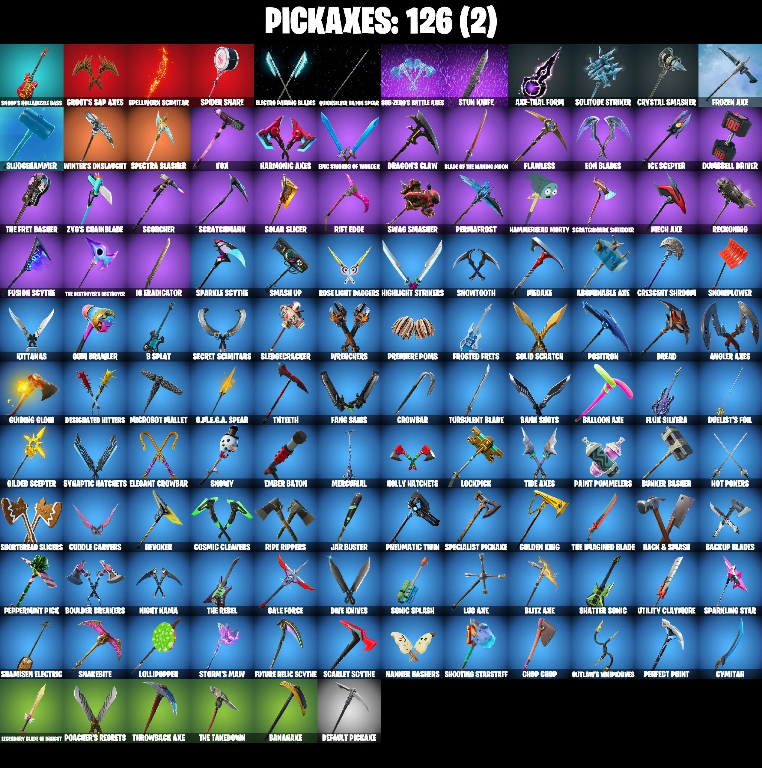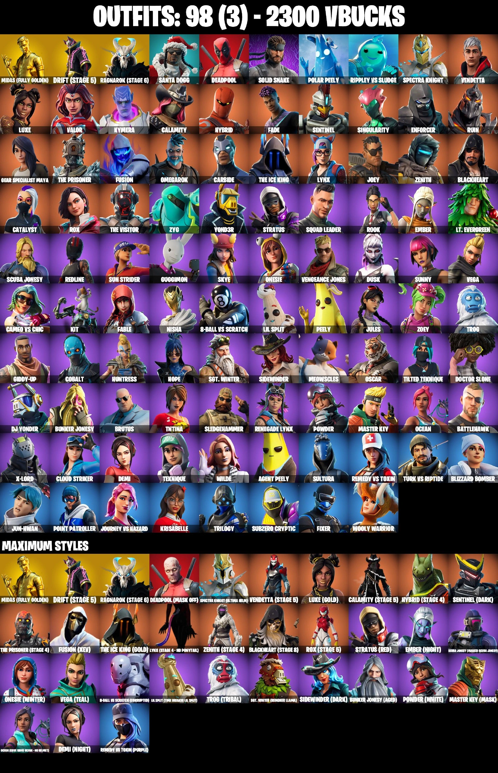 98 SKINS ⸱ AGENT PEELY ⸱ LYNX ⸱ DEADPOOL ⸱ DRIFT MAXED ⸱ AGENT PEELY ⸱ CATALYST ⸱ EVERGREEN ⸱ CALAMITY ⸱ FADE ⸱ LUXE ⸱ MAYA ⸱ BLACKHEART ⸱ VALOR ⸱ POLAR PEELY ⸱ TNTINA ⸱ EVERGREEN ⸱ CARBIDE ⸱ ORANGE JUSTICE ⸱ TAKE THE ELF ⸱ HOT MA