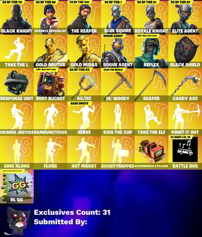 Muita kautta 2 kosmetiikkoja sisältyy - asut kuten Musta Ritari, Sininen Kersantti tai Royale Ritari yhdessä alkuperäisen Floss-emotin kanssa viittaavat siihen, että alkuperäinen omistaja eteni pitkälle Kausi 2 Battle Passissa, mikä lisää tilin kokonaisarvoa.