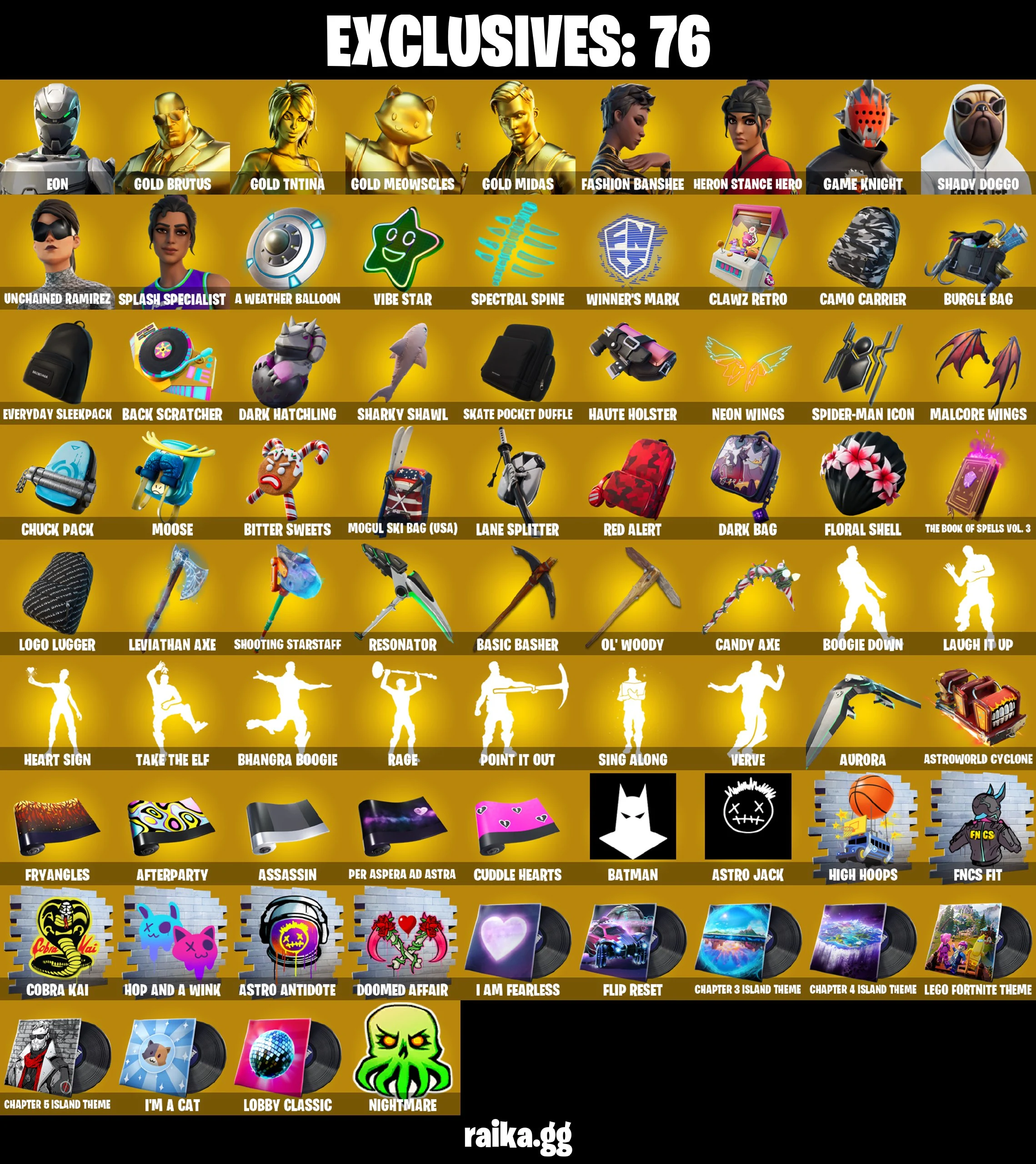 ⭐ Inactive for 4 years | Mail changenable | 129 skins | Eon | Leviathan axe | Uchained Ramirez | Gold Brutus | Gold TNTina | Gold Meowscles | Gold Midas | Fashion Banshee | Heron Stance Hero | Game Knight | Shady Doggo | 120 VB