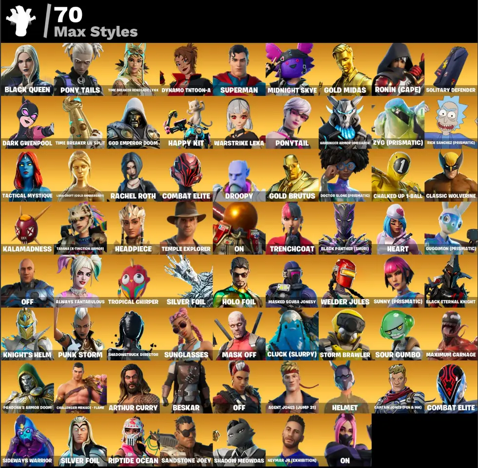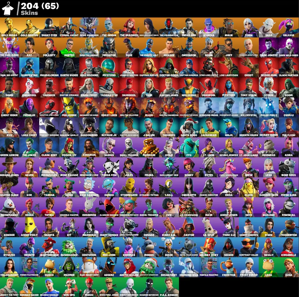 (PC PSN XBOX) 204 skins | CHUN-LI / HARLEY QUINN / RYU / LARA CROFT / THE JOKER / CANDY AXE / THE FLASH / CLAOKED SHADOW / REAPER / Gold Midas | Gold Brutus | Snake Eyes / 550 VB