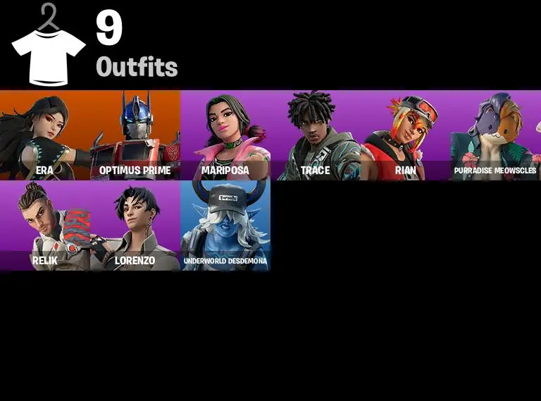 【PC/NS/XBOX/PSN】 9 skins 🔥 Optimus Prime 🔥 Era 🔥 Rian 🔥 Purradise Meowscles 🔥 Trace 🔥 Mariposa 🔥 Relik 🔥 Lorenzo 🔥 Underworld Desdemona 🔥 50 VB