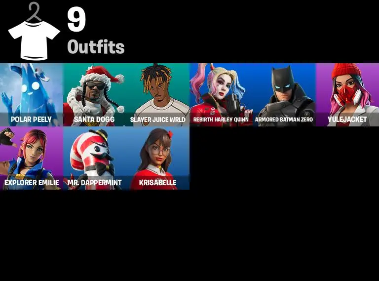 【PC/NS/XBOX/PSN】 9 skins 🔥 Polar Peely 🔥 Slayer Juice WRLD 🔥 Santa Dogg 🔥 Rebirth Harley Quinn 🔥 Armored Batman Zero 🔥 Yulejacket 🔥 0 VB