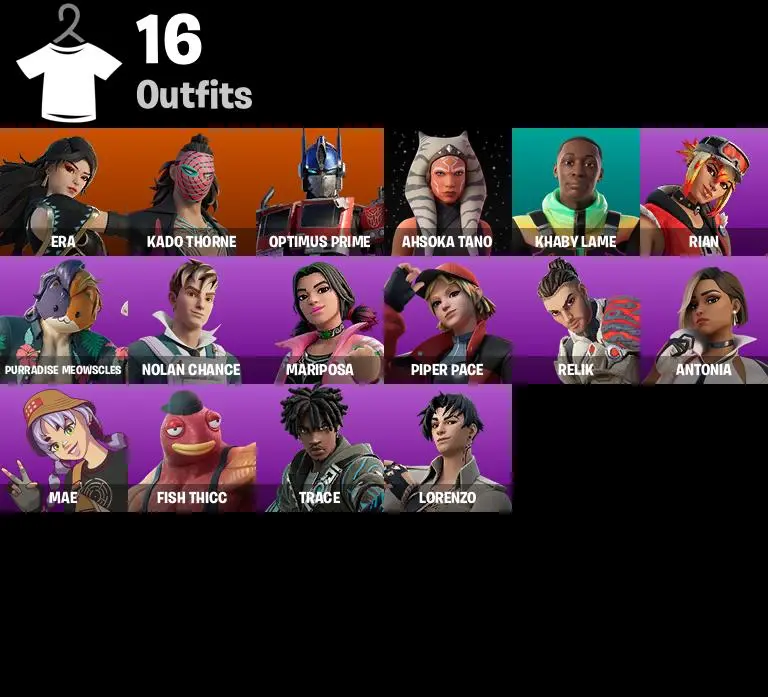 【PC/NS/XBOX/PSN】 【PC】 16 SKINS 🔥 KADO THORNE 🔥 OPTIMUS PRIME 🔥 ERA 🔥 AHSOKA TANO 🔥 KHABY LAME 🔥 RIAN 🔥 NOLAN CHANCE 🔥 ANTONIA 🔥 150 VB