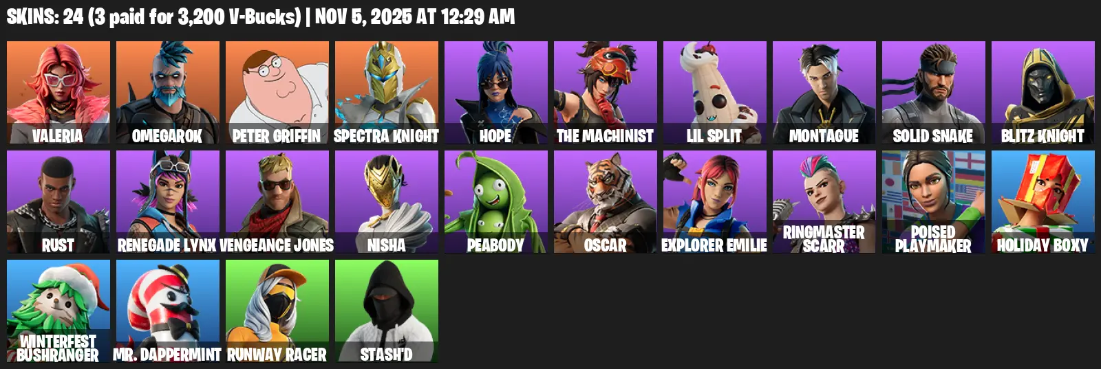 [PC/PSN/XBOX] | 24 skins | 1050 V-bucks | Valeria | Omegarok | Peter Griffin | Spectra Knight | Hope | The Machinist | Lil Split | #JLT0610 | #MBFN