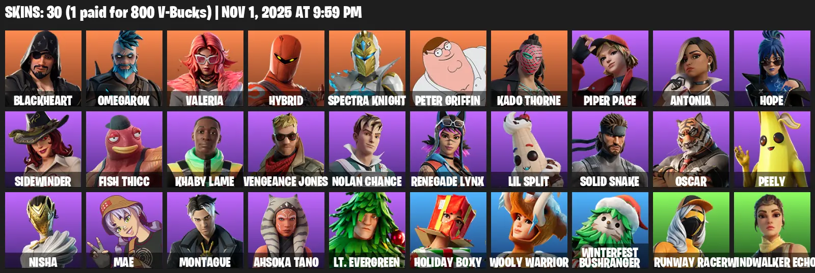 [PC/PSN/XBOX] | 30 skins | 600 V-bucks | Blackheart | Omegarok | Valeria | Hybrid | Spectra Knight | Peter Griffin | Kado Thorne | #ATI2870 | #MBFN