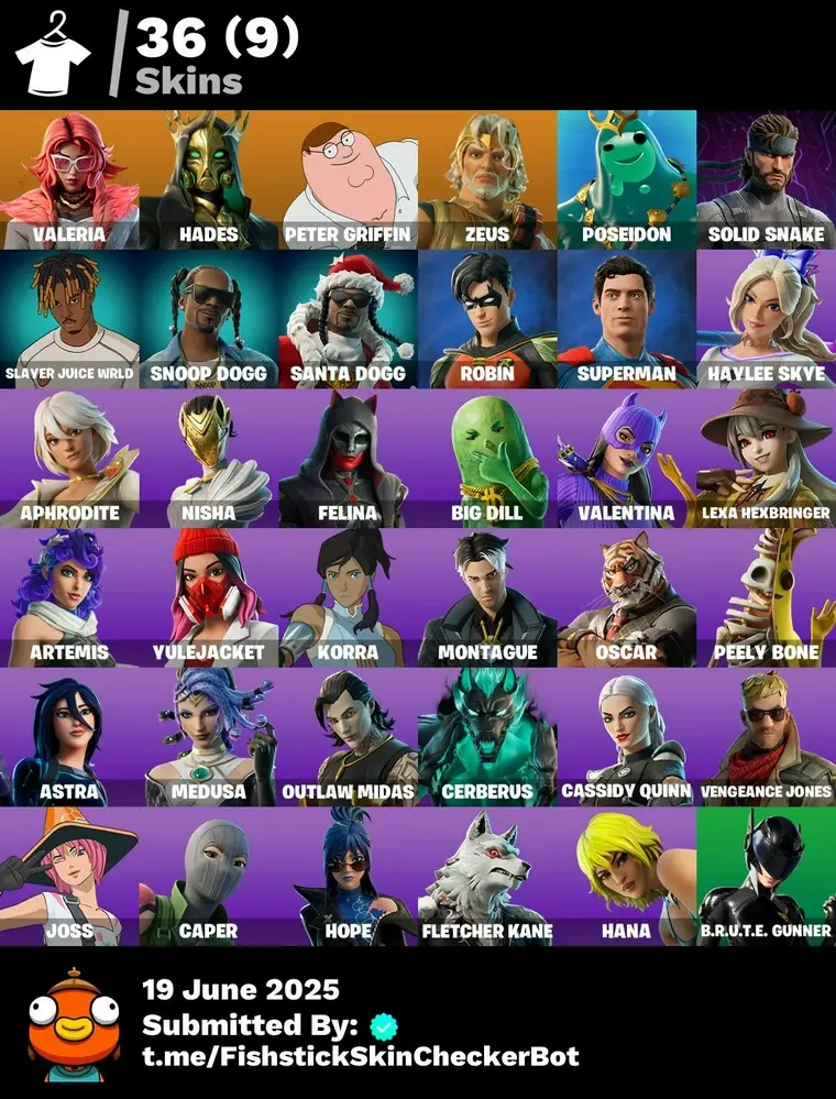[PC/PSN/XBOX] 36 Skins | Hades | Zeus | Peter Griffin | Valeria | Poseidon | Solid Snake | Slayer Juice WRLD | Santa Dogg | Snoop Dogg | Superman | Robin | 700 VB | FN28