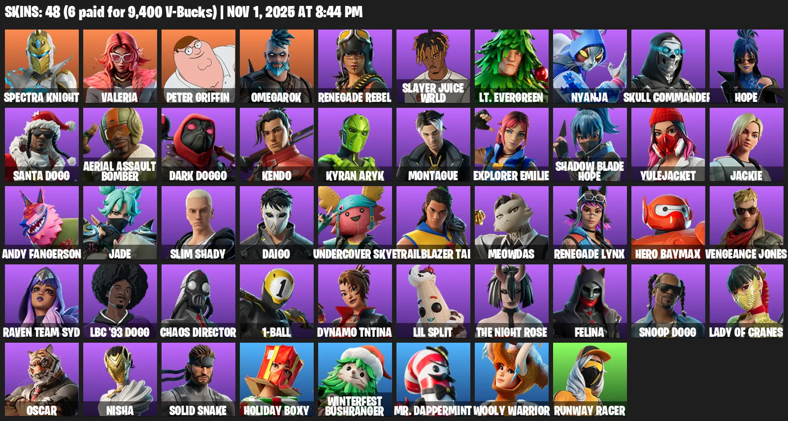 [PC/PSN/XBOX] | 48 skins | 1100 V-bucks | Spectra Knight | Valeria | Peter Griffin | Omegarok | Renegade Rebel | Slayer Juice WRLD | #ACX1950 | #MBFN