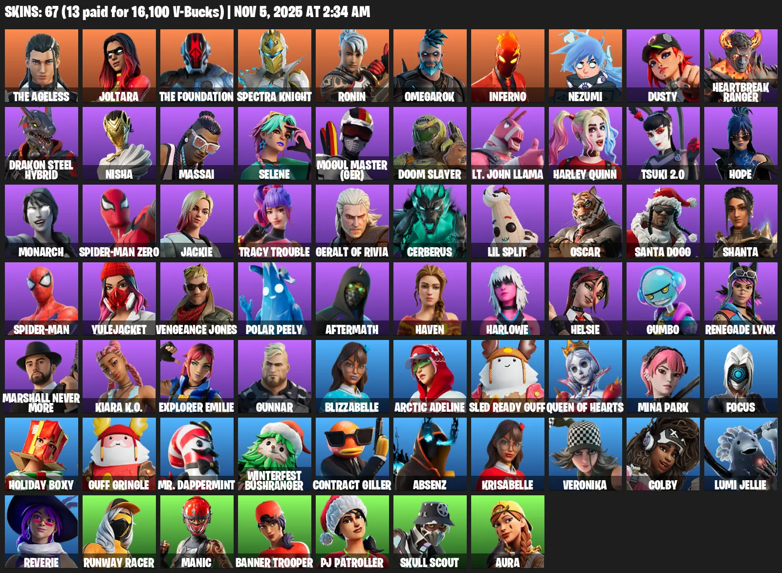 [PC/PSN/XBOX] | 67 skins | 600 V-bucks | The Ageless | Joltara | The Foundation | Spectra Knight | Ronin | Omegarok | Inferno | #OSX3984 | #MBFN