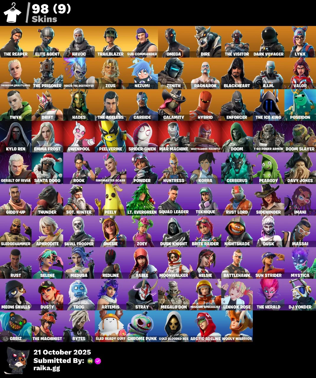 PC/PSN/Xbox/Nintendo 98 skins | The Reaper | Elite Agent | Havoc | Trailblazer | Sub Commander | Omega | Dire | The Visitor | Dark Voyager | Lynx | 1100 VB