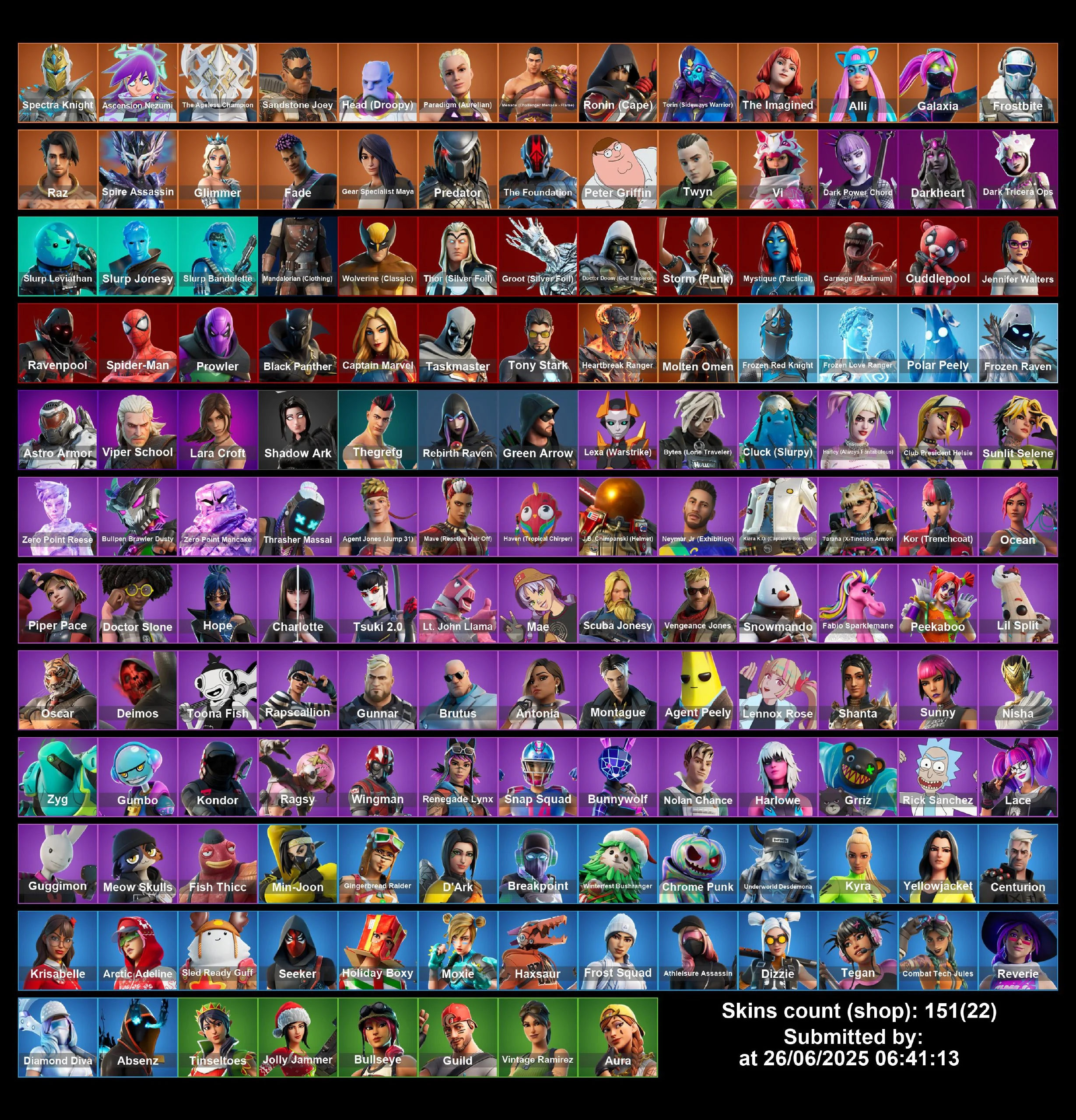 [PC/XBOX] 151 skins | Black Panther | Spider Man | Gref G | Carnage | Rebirth Harley Quinn | Wing Man | Lace | Agent Peely | Molten Omen | Full Email Access
