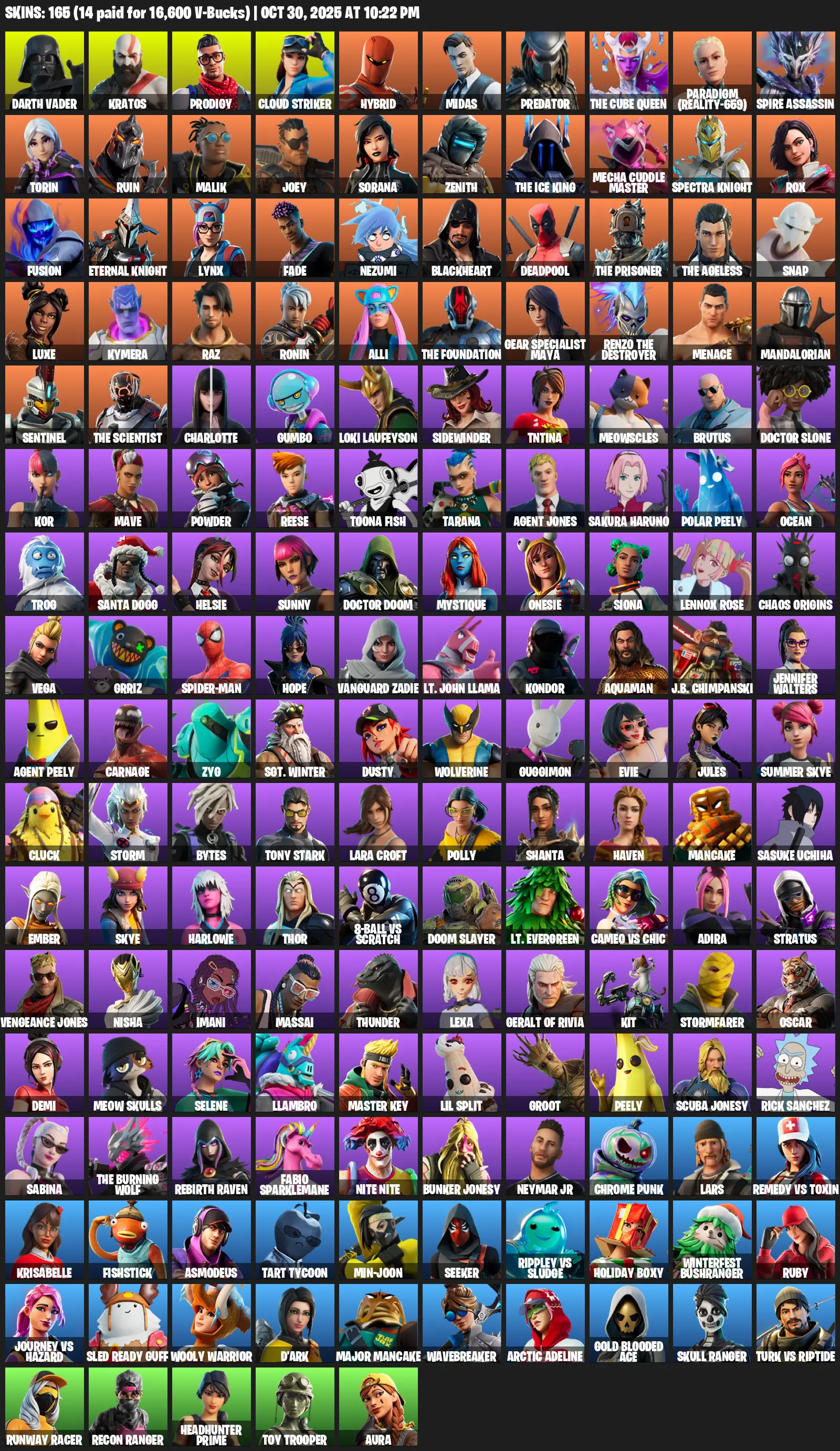 [PC/XBOX] | 165 skins | Lara Croft | Darth Vader | Kratos | Prodigy | Cloud Striker | Hybrid | Midas | Predator | The Cube Queen | #QMT5701 | #MBFN