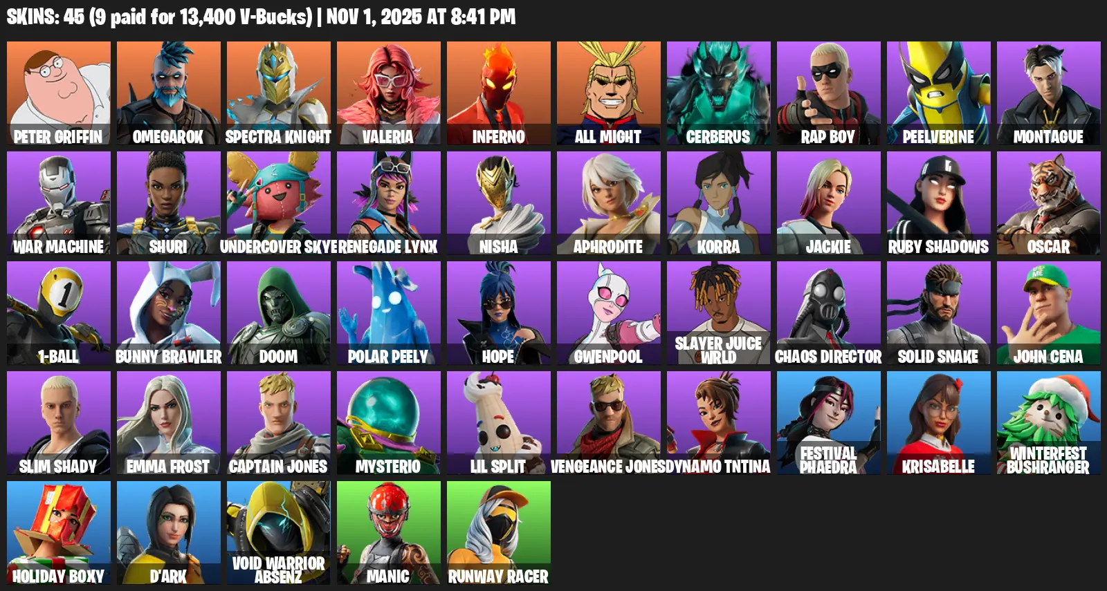 [PC/XBOX] | 45 skins | Peter Griffin | Omegarok | Spectra Knight | Valeria | Inferno | All Might | Cerberus | Rap Boy | Peelverine | #KFI5043 | #MBFN