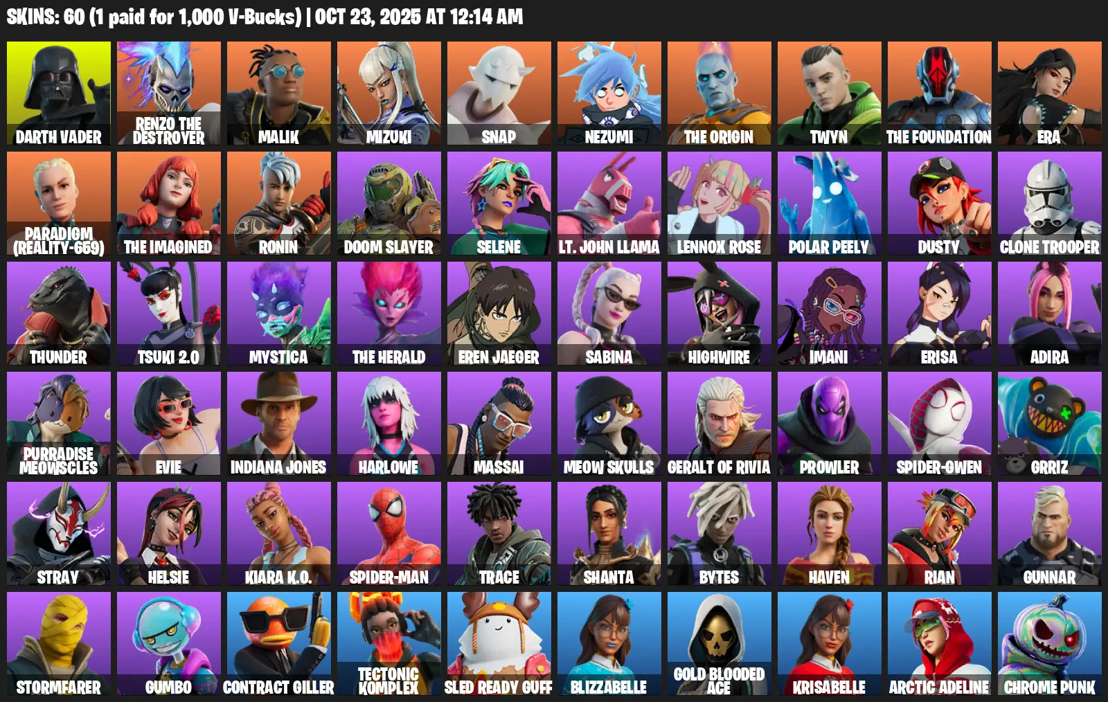 [PC/XBOX] 60 Skins | Darth Vader | Renzo the Destroyer | Malik | Mizuki | Snap | Nezumi | The Origin | Twyn | The Foundation | Era | Paradigm (Reality-659) | The Imagined | Ronin | Doom Slayer | Selene | Lt. John Llama | Lennox Rose | Polar Peely | Dusty