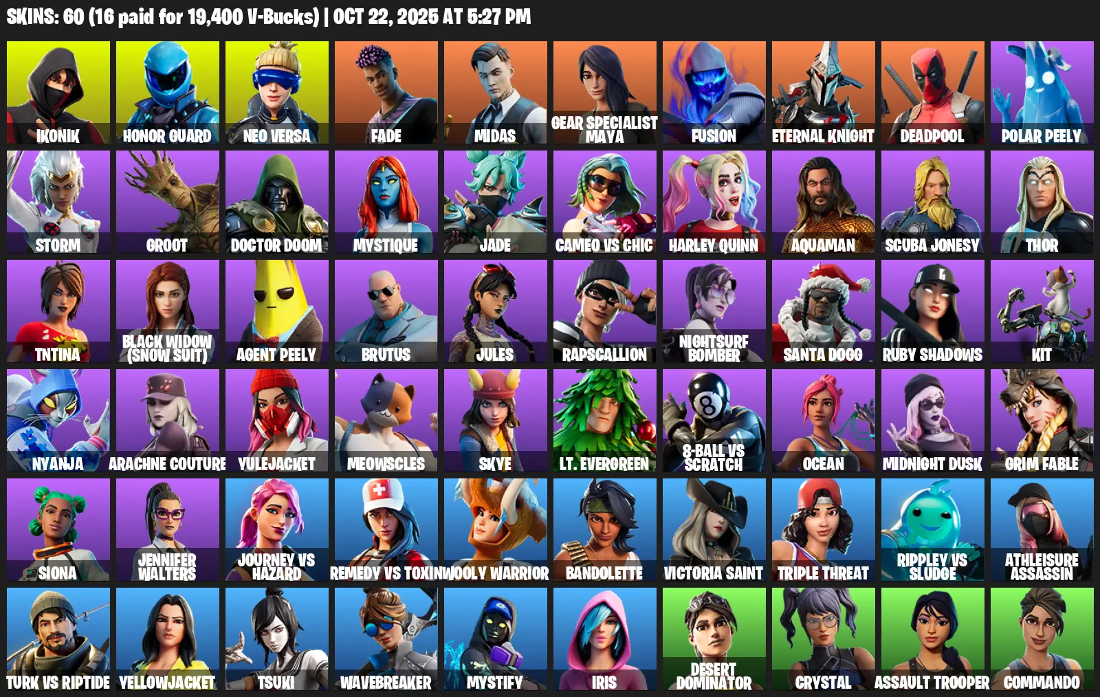 [PC/XBOX] 60 Skins | IKONIK | Honor Guard | Neo Versa | Fade | Midas | Gear Specialist Maya | Fusion | Eternal Knight | Deadpool | Polar Peely | Storm | Groot | Doctor Doom | Mystique | Jade | Cameo vs Chic | Harley Quinn | Aquaman | Scuba Jonesy | Thor