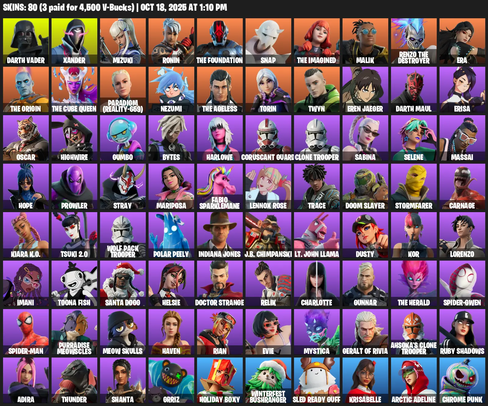 [PC/XBOX/PSN] 80 Skins | Darth Vader | Xander | Mizuki | Ronin | The Foundation | Snap | The Imagined | Malik | Renzo the Destroyer | Era | The Origin | The Cube Queen | Paradigm (Reality-659) | Nezumi | The Ageless | Torin | Twyn | Eren Jaeger