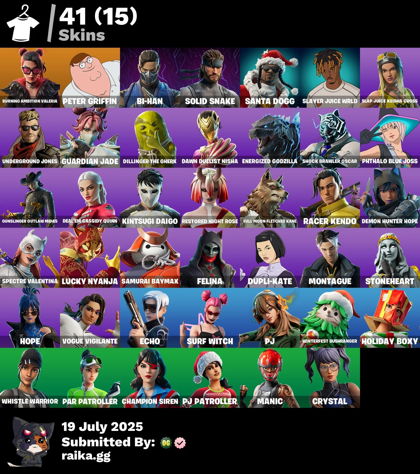 you can change mail [PC/PSN/XBOX/NINTENDO] 41 skins | Surf Witch | Jabba Switchway | Burning Ambition Valeria | Peter Griffin | Bi-Han | Solid Snake | Santa Dogg | Slayer Juice WRLD | 1050 VB kkd01
