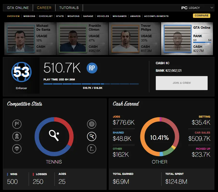SOCIAL CLUB / ROCKSTAR / PC / LEGACY  |  $22.7M total money(bank&cash)  |  GTA5 ONLINE RP LVL(Level) 53  |  MALE  | STORY MODE avaliable | Changable Email | HANDCRAFTED