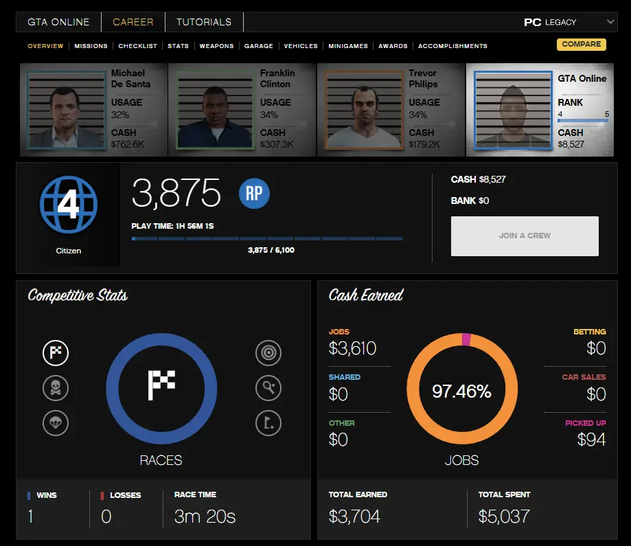 SOCIAL CLUB / ROCKSTAR / PC / LEGACY  |  $8,527 total money(bank&cash)  |  GTA5 ONLINE RP LVL(Level) 4  |  MALE  | STORY MODE avaliable | Changable Email | HANDCRAFTED