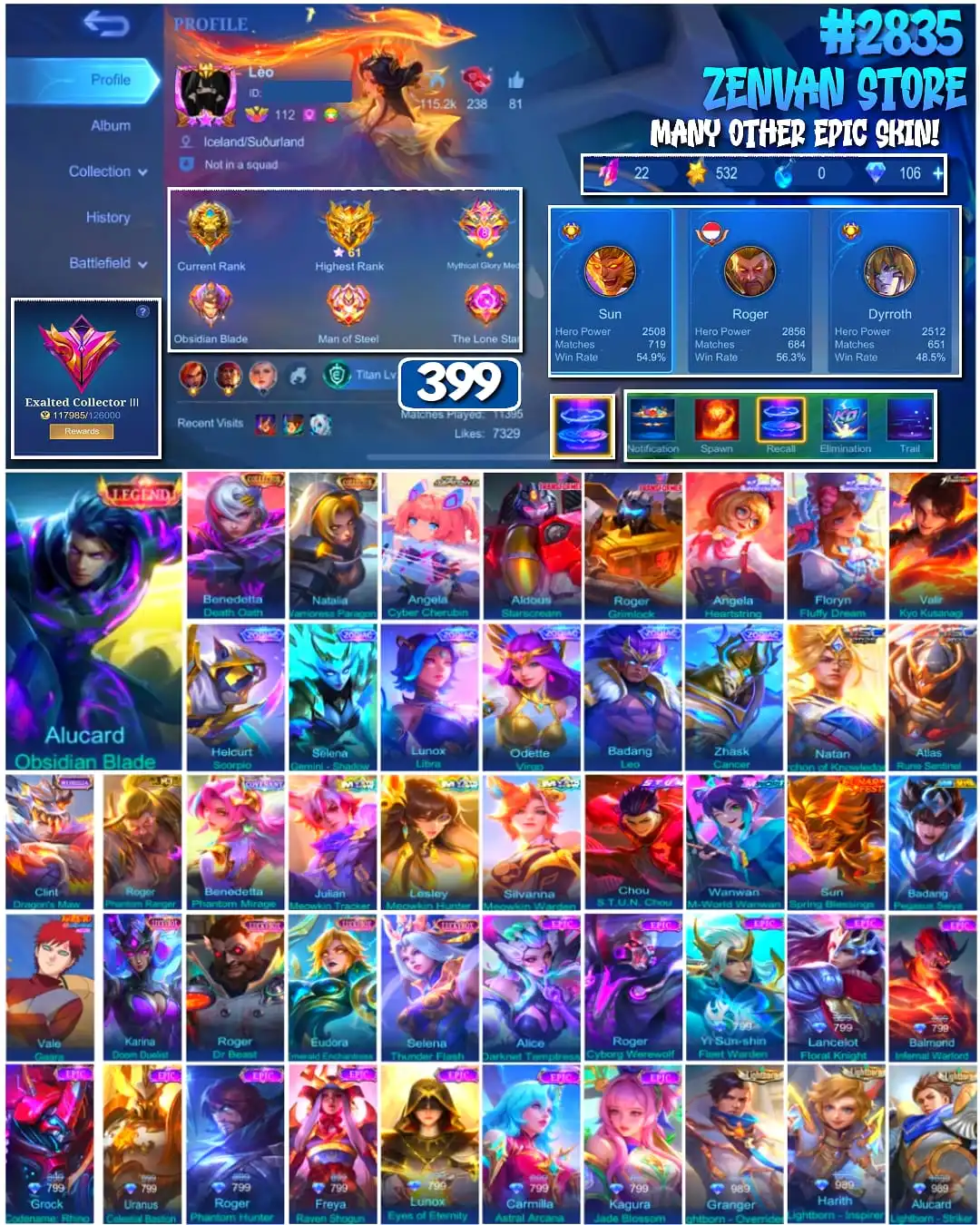#2835 🔥 399 Skins 🔥 Legend Alucard 🔥 Collector Benedetta, Natalia 🔥 Aspirant Angela 🔥 Transformers Aldous, Roger 🔥 Sanrio Floryn 🔥 Stun Chou 🔥 M-World Wanwan 🔥 KoF Valir 🔥 Many Limited 🔥 Many Zodiak 🔥 Many Epic 🔥 Safe Account ✅