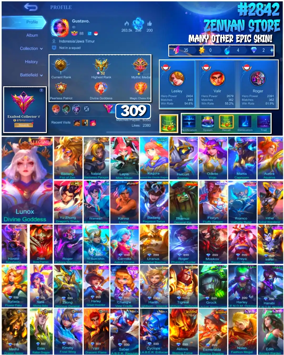#2842 🔥 309 Skins 🔥 Legend Lunox 🔥 Collector Badang, Natalia 🔥 Aspirant Layla 🔥 Clouds Kagura 🔥 Kungfu Panda Thamuz 🔥 M-World Wanwan 🔥 KoF Karina 🔥 Many Limited 🔥 Many Zodiak 🔥 Many Epic 🔥 Safe Account ✅