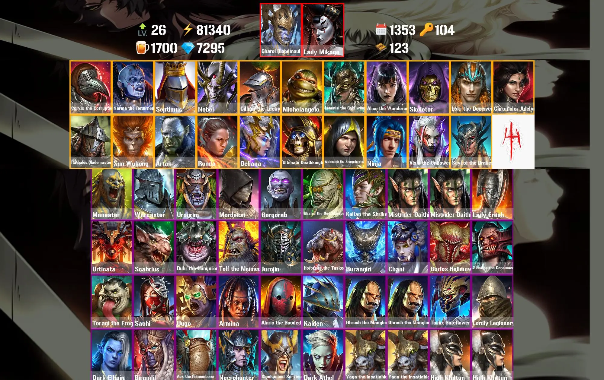 1353 Days 81.3k Energy [Mythical Starter] Gharol Bloodmaul ⸱ Lady Mikage ⸱ Corvis the Corruptor ⸱ Narma the Returned ⸱ Septimus ⸱ Nobel ⸱ Cillian the Lucky ⸱ Maneater ⸱ Warcaster ⸱ 52.9m Silver ⸱ 7.3k Gems